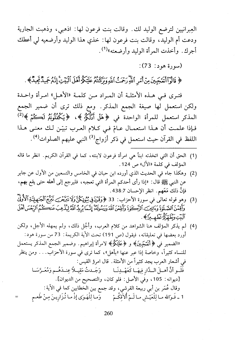 (¬4) لم يذكر المؤلف هنا الشواهد من كلام العرب، وأجَّل ذلك، ولم يمهله الأجل، ولكن أورد بعضها في تعليقاته، فيقول (ص 191) تحت الآية الكريمة: 73 من سورة هود:
