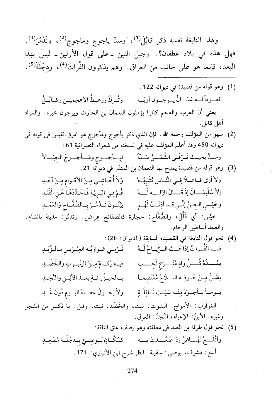 وهذا النابغة نفسه ذكر كابُلَ (¬1)، وسدّ ياجوج وماجوج (¬2)، وتَدْمُرَ (¬3). فهل هذه في بلاد غطفان؟. وجبل التين -على قول الأولين- ليس بهذا البعد، فإنما هو على جانب من العراق. وهم يذكرون الفُراتَ (¬4)، ودِجْلَةَ (¬5)،