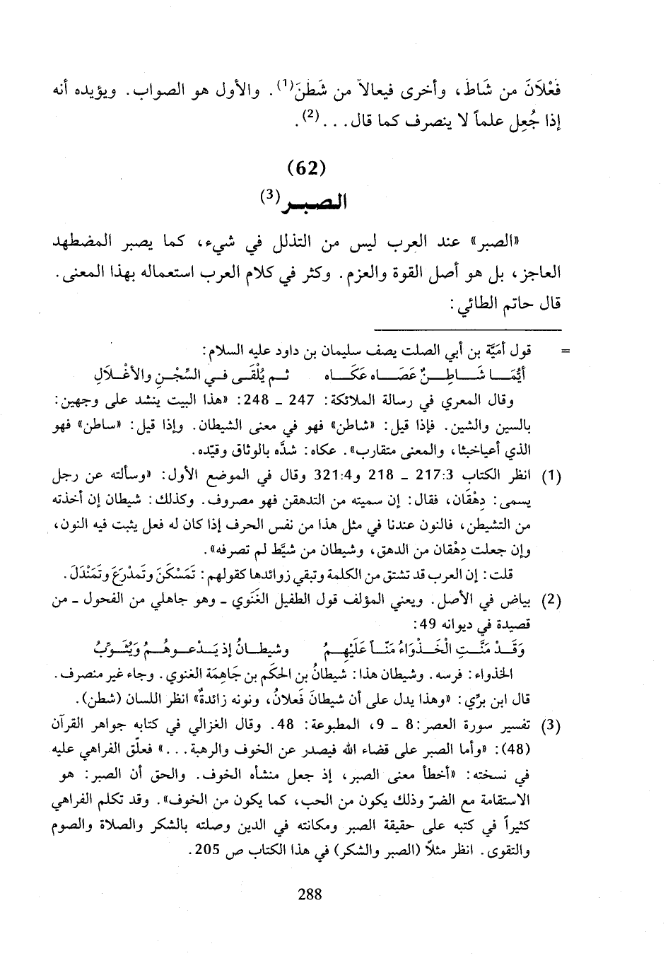 (¬3) تفسير سورة العصر: 8 - 9، المطبوعة: 48. وقال الغزالي في كتابه جواهر القرآن (48): "وأما الصبر على قضاء الله فيصدر عن الخوف والرهبة ... " فعلّق الفراهي عليه في نسخته: "أخطأ معنى الصبر، إذ جعل منشأه الخوف. والحق أن الصبر: هو الاستقامة مع الضرّ وذلك يكون من الحب، كما يكون من الخوف". وقد تكلم الفراهي كثيراً في كتبه على حقيقة الصبر ومكانته في الدين وصلته بالشكر والصلاة والصوم والتقوى. انظر مثلاً (الصبر والشكر) في هذا الكتاب ص 205.