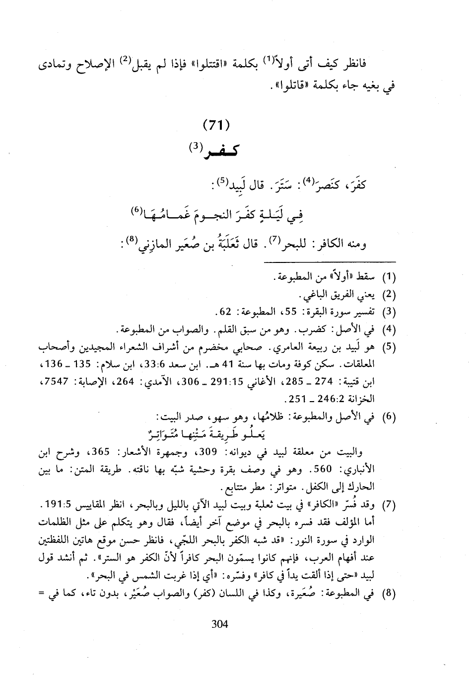 (¬7) وقد فُسّر "الكافر" في بيت ثعلبة وبيت لبيد الآتي بالليل وبالبحر، انظر المقاييس 5: 191. أما المؤلف فقد فسره بالبحر في موضع آخر أيضاً، فقال وهو يتكلم على مثل الظلمات الوارد في سورة النور: "قد شبه الكفر بالبحر اللجّي، فانظر حسن موقع هاتين اللفظتين عند أفهام العرب، فإنهم كانوا يسمّون البحر كافراً لأنّ الكفر هو الستر". ثم أنشد قول لبيد "حتى إذا ألقت يداً في كافر" وفسّره: "أي إذا غربت الشمس في البحر".