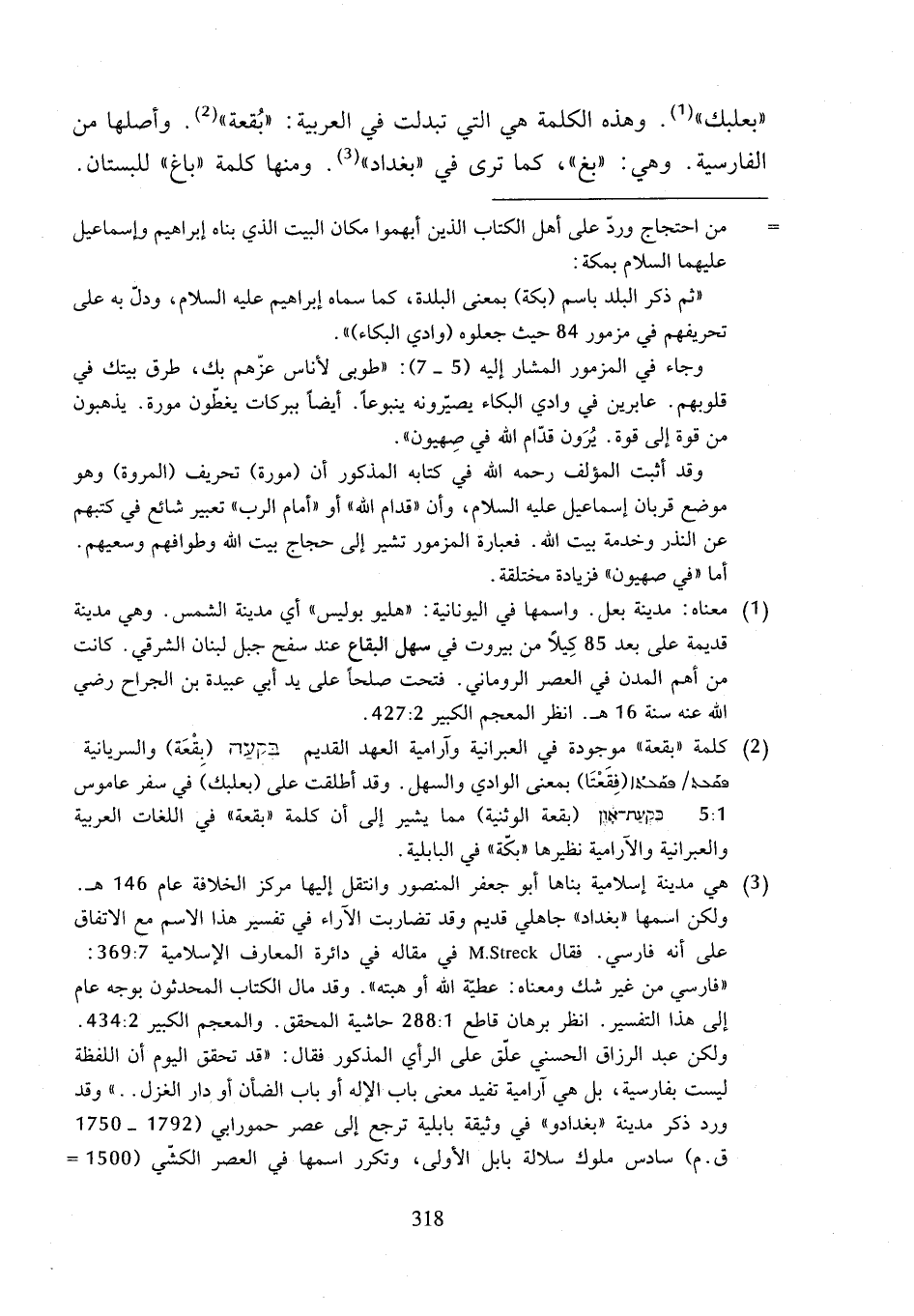 (¬2) كلمة "بقعة" موجودة في العبرانية وآرامية العهد القديم [. . .] (بِقْعَة) والسريانية [. . .] (فِقَعْتَا) بمعنى الوادي والسهل. وقد أطلقت على (بعلبك) في سفر عاموس 1: 5 [. . .] (بقعة الوثنية) مما يشير إلى أن كلمة "بقعة" في اللغات العربية والعبرانية والآرامية نظيرها "بكّة" في البابلية.