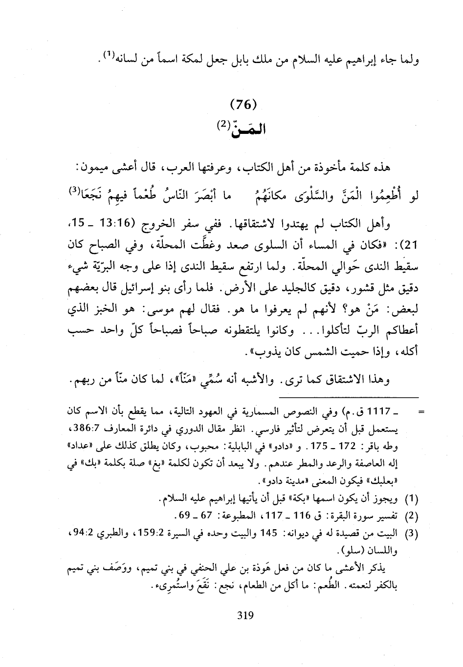 وأهل الكتاب لم يهتدوا لاشتقاقها. ففي سفر الخروج (16:13 - 15، 21): "فكان في المساء أن السلوى صعد وغطَّت المحلّة، وفي الصباح كان سقيط الندى حَوالي المحلّة. ولما ارتفع سقيط الندى إذا على وجه البرّيّة شيء دقيق مثل قشور، دقيق كالجليد على الأرض. فلما رأى بنو إسرائيل قال بعضهم لبعض: مَنْ هو؟ لأنهم لم يعرفوا ما هو. فقال لهم موسى: هو الخبز الذي أعطاكم الربّ لتأكلوا ... وكانوا يلتقطونه صباحاً فصباحاً كلّ واحد حسب أكله، وإذا حميت الشمس كان يذوب".