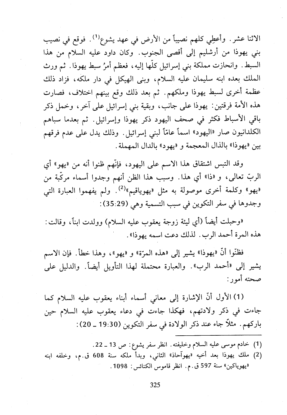 وقد التبس اشتقاق هذا الاسم على اليهود، فإنّهم ظنوا أنه من "يهو" أي الربّ تعالى، و "ذا" أي هذا. وسبب هذا الظن أنهم وجدوا أسماء مركّبة من "يهو" وكلمة أخرى موصولة به مثل "يهوياقيم" (¬2). ولم يفهموا العبارة التي وجدوها في سفر التكوين في سبب التسمية وهي (29: 35):