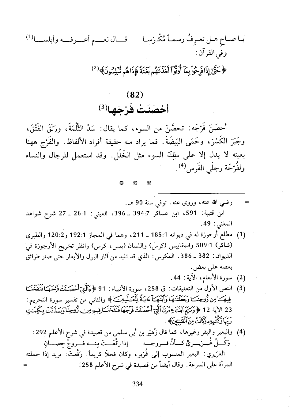 أحصَنَ فَرْجَه: تحصَّنَ من السوء، كما يقال: سَدَّ الثُّلْمَةَ، ورَتَقَ الفَتْقَ، وجَبَرَ الكَسْرَ، وحَمَى البَيضَةَ. فما يراد منه حقيقة أفراد الألفاظ. والفَرْج هاهنا بعينه لا يدل إلا على مظِنّة السوء مثل الخَلَل. وقد استعمل للرجال والنساء ولفُرْجَة رجلَي الفَرس (¬4).