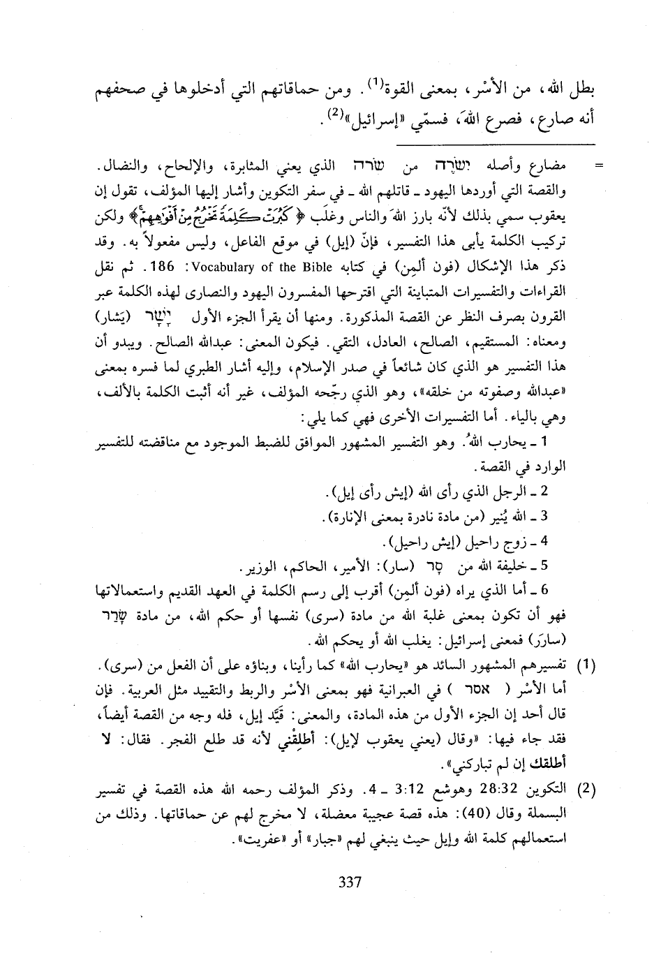 (¬1) تفسيرهم المشهور السائد هو "يحارب الله" كما رأينا، وبناؤه على أن الفعل من (سرى)، أما الأسْر [. . .] في العبرانية فهو بمعنى الأسْر والربط والتقييد مثل العربية. فإن قال أحد إن الجزء الأول من هذه المادة، والمعنى: قَيَّد إيل، فله وجه من القصة أيضاً، فقد جاء فيها: "وقال (يعني يعقوب لإيل): أطلِقْني لأنه قد طلع الفجر. فقال: لا أطلقك إن لم تباركني".