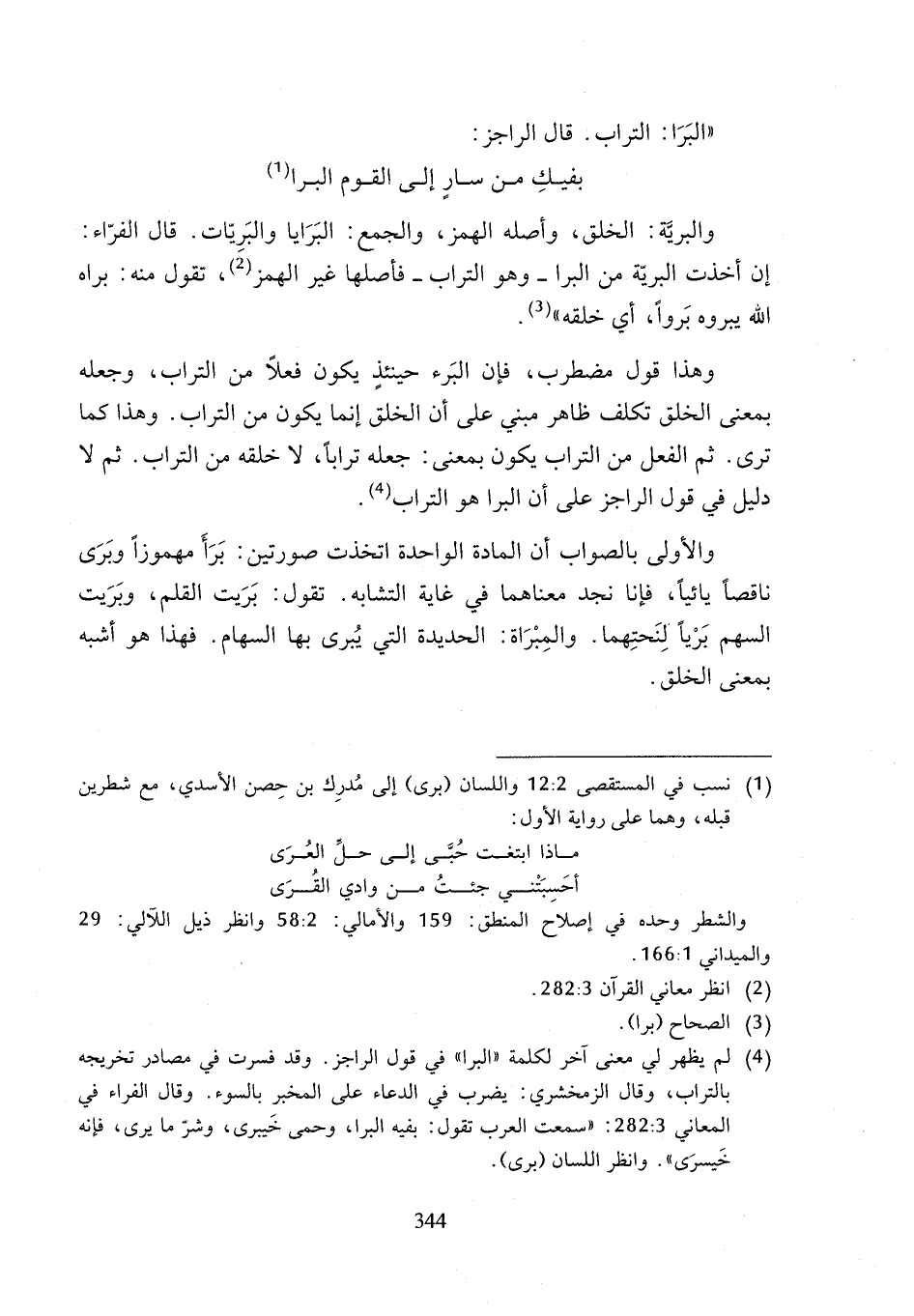 وهذا قول مضطرب، فإن البَرء حينئذٍ يكون فعلاً من التراب، وجعله بمعنى الخلق تكلف ظاهر مبني على أن الخلق إنما يكون من التراب. وهذا كما ترى. ثم الفعل من التراب يكون بمعنى: جعله تراباً، لا خلقه من التراب. ثم لا دليل في قول الراجز على أن البرا هو التراب (¬4).