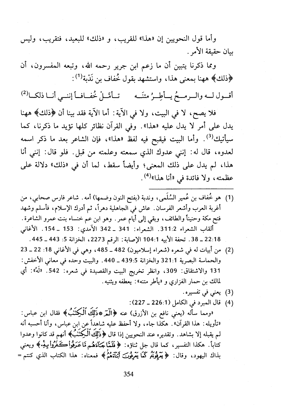 ومما ذكرنا يتبين أن ما زعم ابن جرير رحمه الله، وتبعه المفسرون، أن {ذلك} هاهنا بمعنى هذا، واستشهد بقول خُفاف بن نَدْبة (¬1):