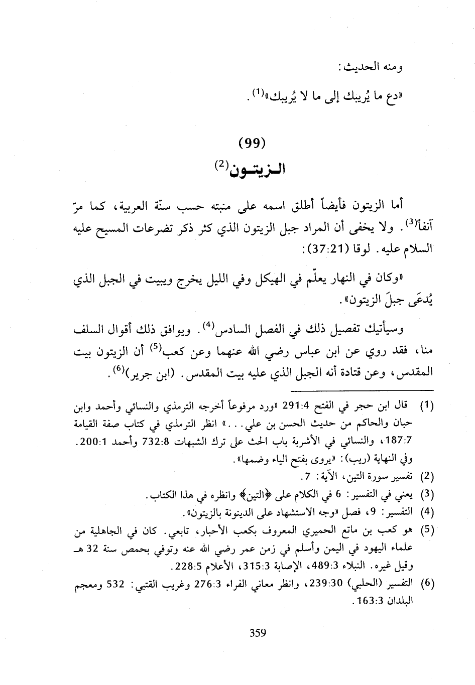 وسيأتيك تفصيل ذلك في الفصل السادس (¬4). ويوافق ذلك أقوال السلف منا، فقد روي عن ابن عباس رضي الله عنهما وعن كعب (¬5) أن الزيتون بيت المقدس، وعن قتادة أنه الجبل الذي عليه بيت المقدس. (ابن جرير) (¬6).