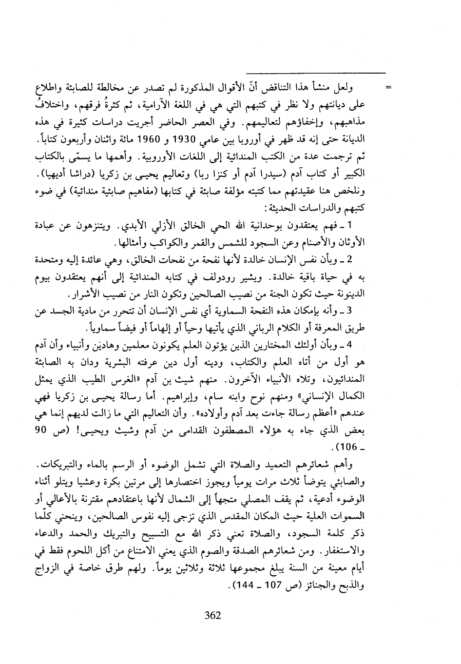 = ولعل منشأ هذا التناقض أنّ الأقوال المذكورة لم تصدر عن مخالطة للصابئة واطلاع على ديانتهم ولا نظر في كتبهم التي هي في اللغة الآرامية، ثم كثرةُ فرقهم، واختلافُ مذاهبهم، وإخفاؤهم لتعاليمهم. وفي العصر الحاضر أجريت دراسات كثيرة في هذه الديانة حتى إنه قد ظهر في أوروبا بين عامي 1930 و1960 مائة واثنان وأربعون كتاباً. ثم ترجمت عدة من الكتب المندائية إلى اللغات الأوروبية. وأهمها ما يسمّى بالكتاب الكبير أو كتاب آدم (سيدرا آدم أو كنزا ربا) وتعاليم يحيى بن زكريا (دراشا أديهيا). ونلخص هنا عقيدتهم مما كتبته مؤلفة صابئة في كتابها (مفاهيم صابئية مندائية) في ضوء كتبهم والدراسات الحديثة: