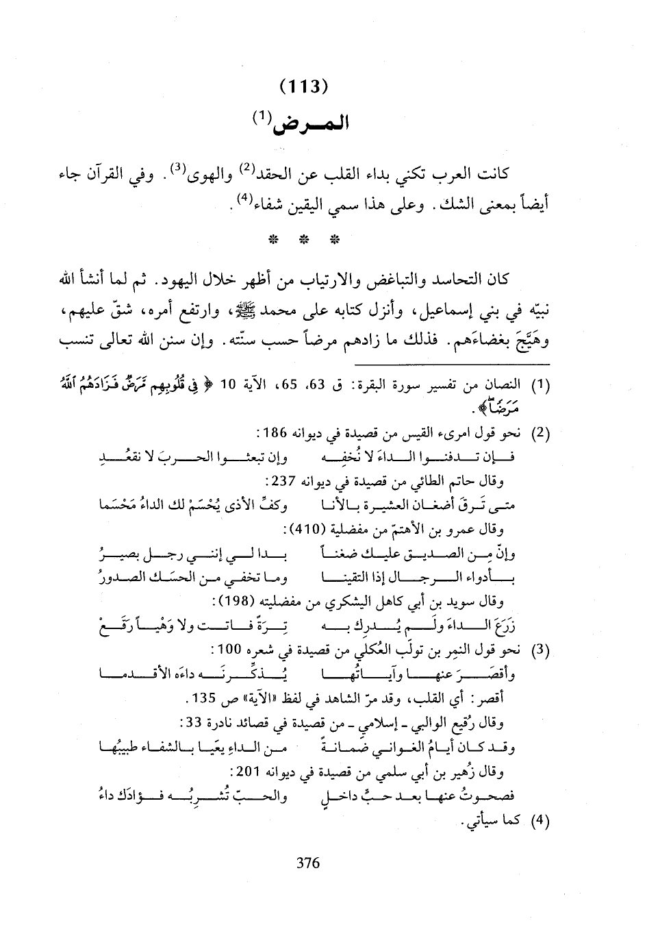 كانت العرب تكني بداء القلب عن الحقد (¬2) والهوى (¬3). وفي القرآن جاء أيضاً بمعنى الشك. وعلى هذا سمي اليقين شفاء (¬4).