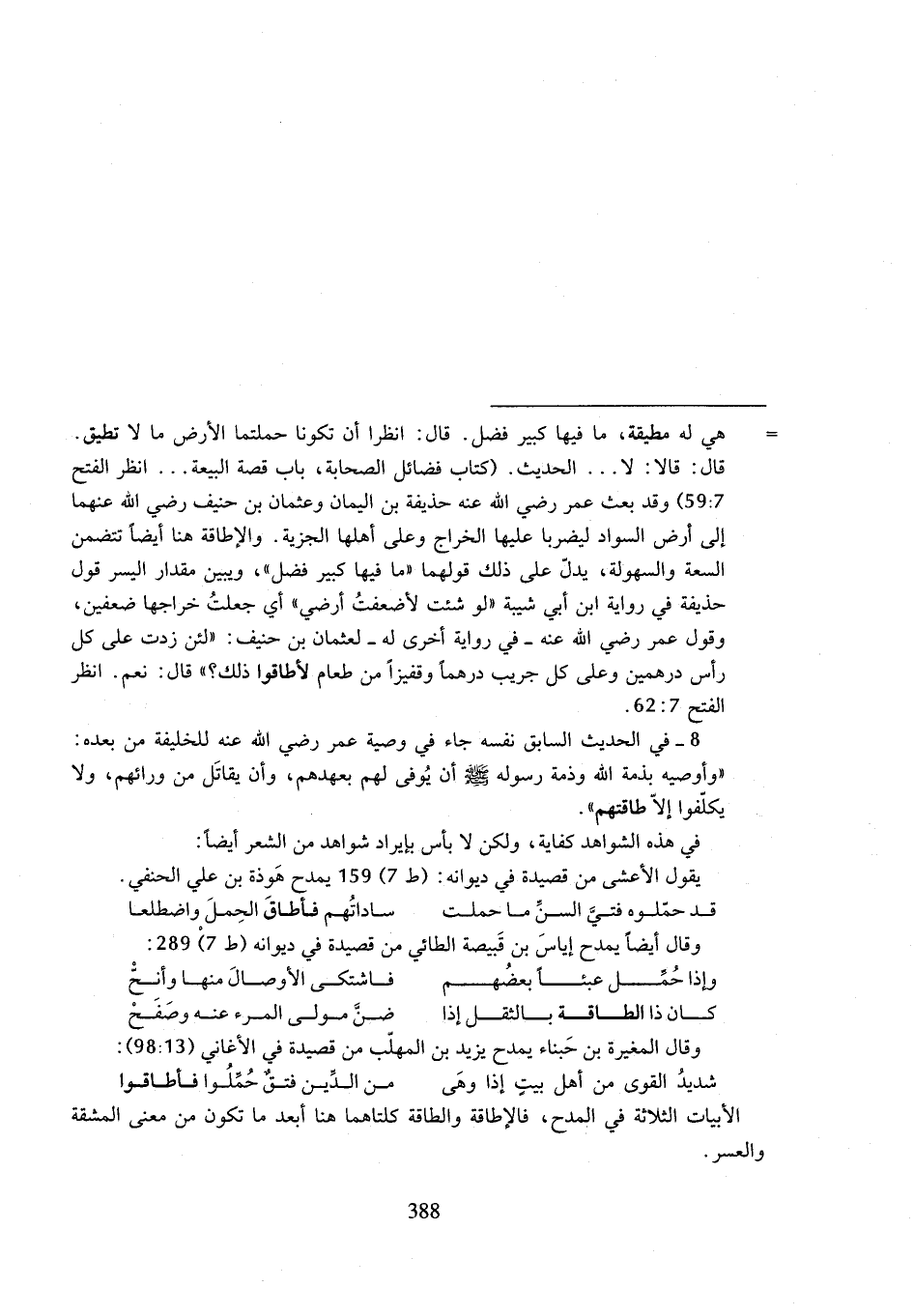 = هي له مطيقة، ما فيها كبير فضل. قال: انظرا أن تكونا حملتما الأرض ما لا تطيق. قال: قالا: لا ... الحديث. (كتاب فضائل الصحابة، باب قصة البيعة ... انظر الفتح 59:7) وقد بعث عمر رضي الله عنه حذيفة بن اليمان وعثمان بن حنيف رضي الله عنهما إلى أرض السواد ليضربا عليها الخراج وعلى أهلها الجزية. والإطاقة هنا أيضاً تتضمن السعة والسهولة، يدلّ على ذلك قولهما "ما فيها كبير فضل"، ويبين مقدار اليسر قول حذيفة في رواية ابن أبي شيبة "لو شئت لأضعفتُ أرضي" أي جعلتُ خراجها ضعفين، وقول عمر رضي الله عنه -في رواية أخرى له- لعثمان بن حنيف: "لئن زدت على كل رأس درهمين وعلى كل جريب درهماً وقفيزاً من طعام لأطاقوا ذلك؟ " قال: نعم. انظر الفتح 7: 62.