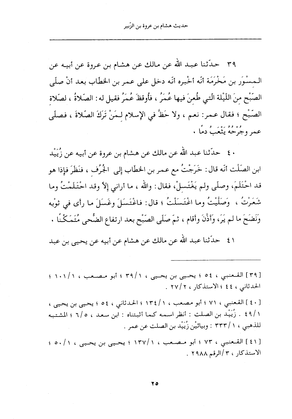 95- حدثنا عبد الله عن مالك عن يحيى بن سعيد عن محمد بن -[58]- إبراهيم عن أبي سلمة بن عبد الرحمان عن أبي سعيد الخدري أنه قال: سمعت رسول الله عليه السلام يقول: يخرج فيكم قوم تحقرون صلاتكم مع صلاتهم وأعمالكم مع أعمالهم يقرؤون القرآن لا يجاوز حناجرهم يمرقون من الدين مروق السهم من الرمية تنظر في النصل فلا ترى شيئا ثم تنظر في القدح فلا ترى شيئا ثم تنظر في الريش فلا ترى شيئا وتتمارى في الفوق.
