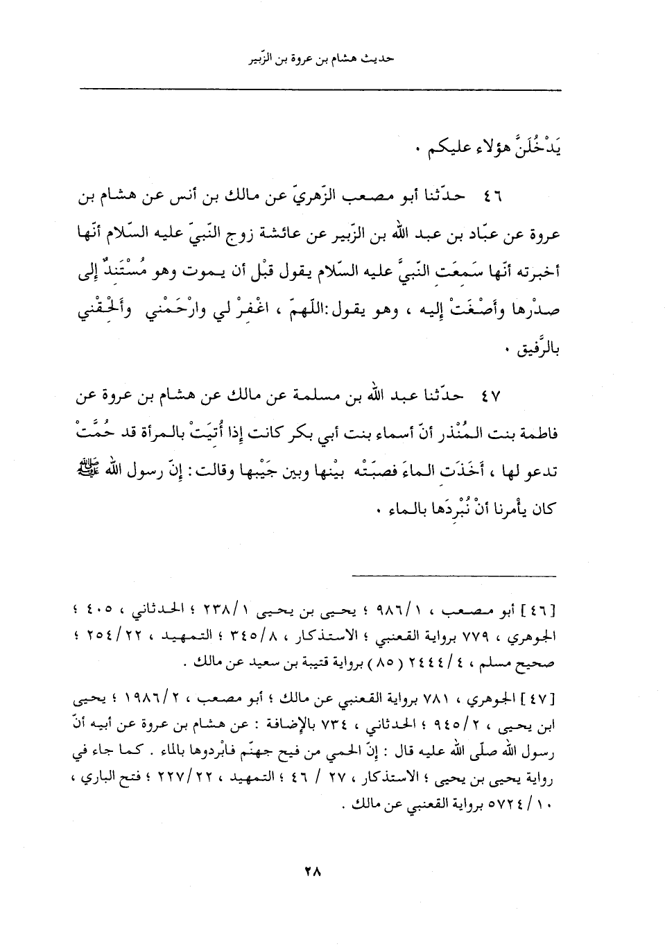 100- حدثنا أبو مصعب قال حدثنا مالك عن يحيى بن سعيد عن -[61]- محمد بن يحيى بن حبان عن القاسم بن محمد عن عائشة زوج النبي عليه السلام أنها قالت: مر على عمر بن الخطاب بغنم من الصدقة فرأى فيها شاة حافلا ذات ضرع عظيم فقال عمر: ما هذه الشاة فقالوا: شاة من الصدقة فقال عمر: ما أعطى هذه أهلها وهم طائعون لا تفتنوا الناس لا تأخذوا حزرات المسلمين نكبوا عن الطعام.