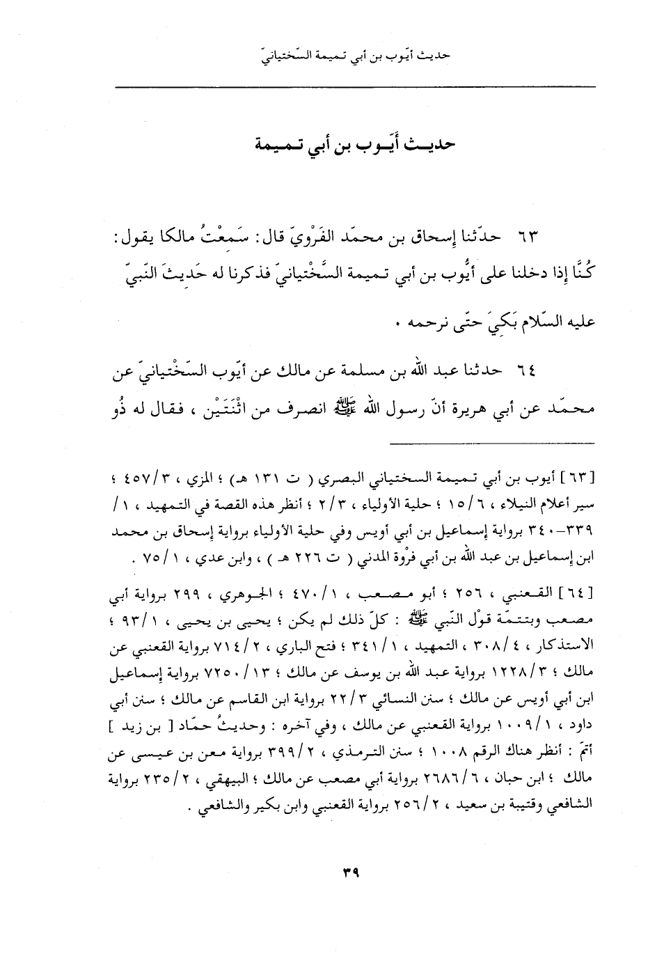 117- حدثنا عبد الله عن مالك عن مخرمة بن سليمان عن كريب مولى ابن عباس أن عبد الله بن عباس أخبره أنه بات عند ميمونة زوج النبي عليه السلام وهي خالته فاضطجعت في عرض الوسادة واضطجع رسول الله وأهله في طولها فنام رسول الله عليه السلام حتى إذا انتصف الليل أو قبله بقليل أو بعده بقليل استيقظ رسول الله عليه السلام فجلس يمسح النوم -[72]- عن وجهه بيده ثم قرأ رسول الله صلى الله عليه وسلم العشر الآيات الخواتم من سورة آل عمران ثم قام إلى شنة معلقة فتوضأ منها وأحسن وضوءه ثم قام فصلى قال عبد الله: فقمت فصنعت مثل ما صنع ثم ذهبت فقمت إلى جنبه فوضع رسول الله يده اليمنى على رأسي وأخذ بأذني يفتلها فصلى ركعتين ثم ركعتين ثم ركعتين ثم ركعتين ثم ركعتين ثم ركعتين ثم أوتر ثم اضطجع حتى جاء المؤذن فقام فصلى ركعتين خفيفتين ثم خرج فصلى الصبح.
