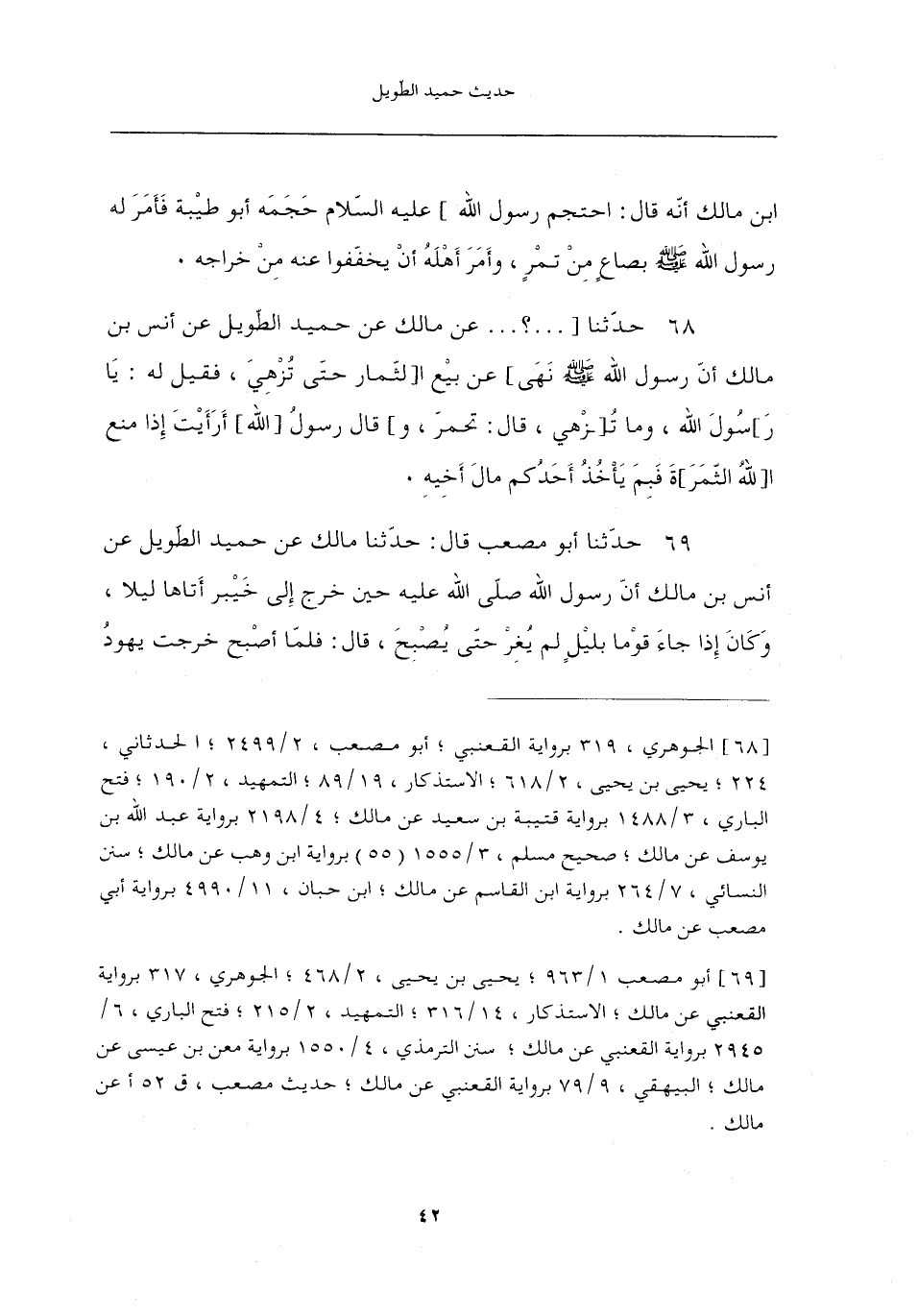 123- حدثنا عبد الله عن مالك عن زيد بن أبي أنيسة أن عبد -[75]- الحميد بن عبد الرحمان بن زيد بن الخطاب أخبره عن مسلم بن يسار الجهني أن عمر بن الخطاب سئل عن هذه الآية {وإذ أخذ ربك من بني آدم من ظهورهم ذريتهم وأشهدهم على أنفسهم ألست بربكم قالوا بلى شهدنا أن تقولوا يوم القيامة إنا كنا عن هذا غافلين} فقال عمر بن الخطاب: سمعت رسول الله عليه السلام سئل عنها فقال رسول الله عليه السلام: إن الله خلق آدم ثم مسح ظهره بيمينه فاستخرج منه ذرية فقال: خلقت هؤلاء للجنة وبعمل أهل الجنة يعملون ثم مسح ظهره فاستخرج منه ذرية فقال: خلقت هؤلاء للنار وبعمل أهل النار يعملون فقال رجل: يارسول الله ففيما العمل؟ فقال رسول الله عليه السلام: إن الله إذا خلق العبد للجنة استعمله بعمل أهل الجنة حتى يموت على عمل من أعمال أهل الجنة فيدخله به الجنة وإذا خلق العبد للنار استعمله بعمل النار حتى يموت على عمل من أعمال أهل النار فيدخله به النار.