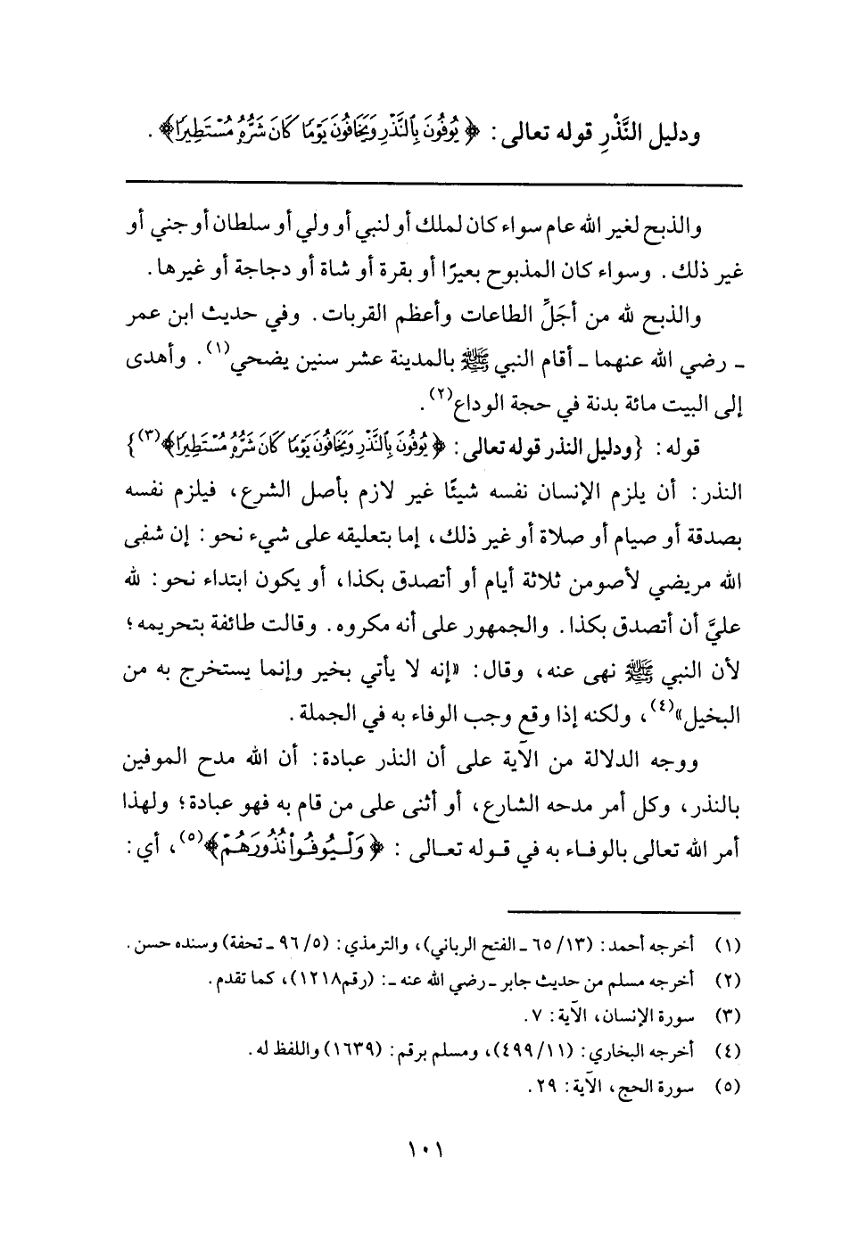 ووجه الدلالة من الآية على أن النذر عبادة: أن الله مدح الموفين بالنذر، وكل أمر مدحه الشارع، أو أثنى على من قام به فهو عبادة؛ ولهذا أمر الله تعالى بالوفاء به قوله تعالى: {وَلْيُوفُوا نُذُورَهُمْ} 5، أي: