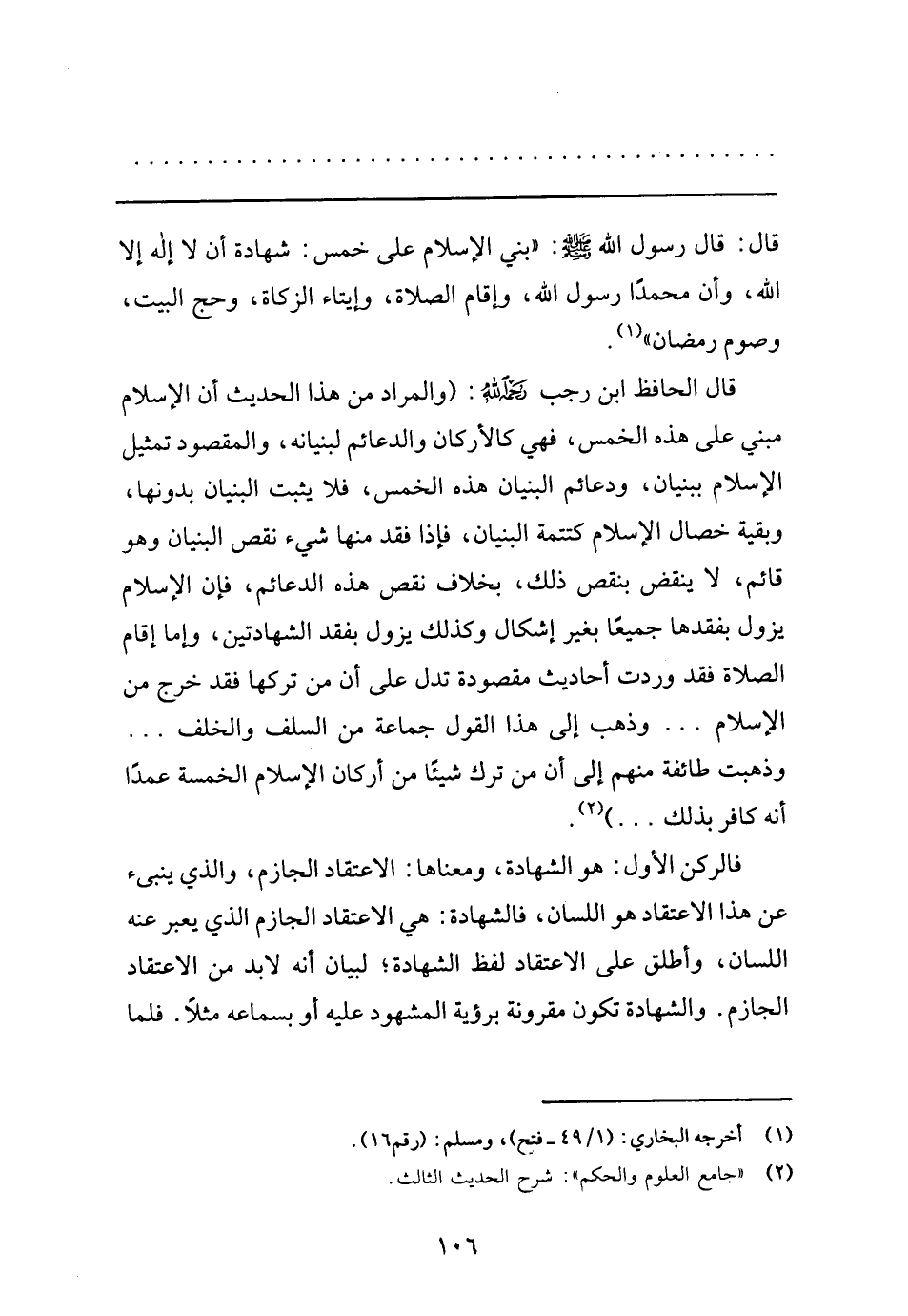 فالركن الأول: هو الشهادة ومعناها: الاعتقاد الجازم، والذي ينبئ عن هذا الاعتقاد هو اللسان، فالشهادة: هي الاعتقاد الجازم الذي يعبر عنه اللسان، وأطلق على الاعتقاد لفظ الشهادة؛ لبيان أنه لابد من الاعتقاد الجازم. والشهادة تكون مقرونة برؤية المشهود عليه أو بسماعه مثلاً. فلما