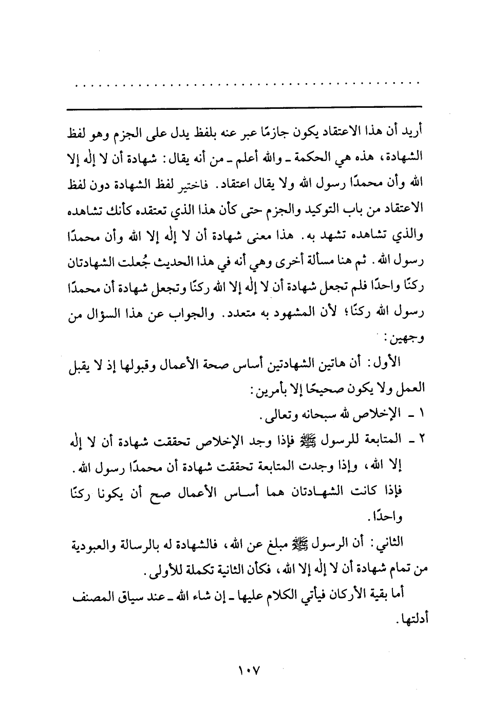 الأول: أن هاتين الشهادتين أساس صحة الأعمال وقبولها إذ لا يقبل العمل ولا يكون صحيحاً إلا بأمرين: