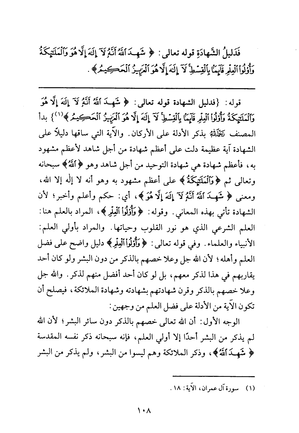 قوله: "فَدَلِيلُ الشَّهَادَةِ قَوْلُهُ تَعَالَى: {شَهِدَ اللَّهُ أَنَّهُ لا إِلَهَ إِلَّا هُوَ وَالْمَلائِكَةُ وَأُولُو الْعِلْمِ قَائِماً بِالْقِسْطِ لاَ إِلَهَ إِلَّا هُوَ الْعَزِيزُ الْحَكِيمُ} 1" بدأ المصنف رحمه الله بذكر الأدلة على الأركان. والآية التي ساقها دليلاً على الشهادة آية عظيمة دلت على أعظم شهادة من أجل شاهد لأعظم مشهود به، فأعظم شهادة هي شهادة التوحيد من أجل شاهد وهو {اللَّهُ} سبحانه وتعالى ثم {والْمَلائِكَةُ} على أعظم مشهود به وهو أنه لا إله إلا الله، ومعنى {شَهِدَ اللَّهُ أَنَّهُ لاَ إِلَهَ إِلَّا هُوَ} ، أي: حكم وأعلم وأخبر؛ لأن الشهادة تأتي بهذه المعاني: وقوله: {وَأُولُو الْعِلْمِ} ، المراد بالعلم هنا: العلم الشرعي الذي هو نور القلوب وحياتها. والمراد بأولي العلم: الأنبياء والعلماء. وفي قوله تعالى: {وَأُولُو الْعِلْمِ} دليل واضح على فضل العلم وأهله؛ لأن الله جل وعلا خصهم بالذكر من دون البشر ولو كان أحد يقاربهم في هذا لذكر معهم، بل لو كان أحد أفضل منهم لذكر. والله جل وعلا خصهم بالذكر وقرن شهادتهم بشهادته وشهادة الملائكة، فيصلح أن تكون الآية من الأدلة على فضل العلم من وجهين: