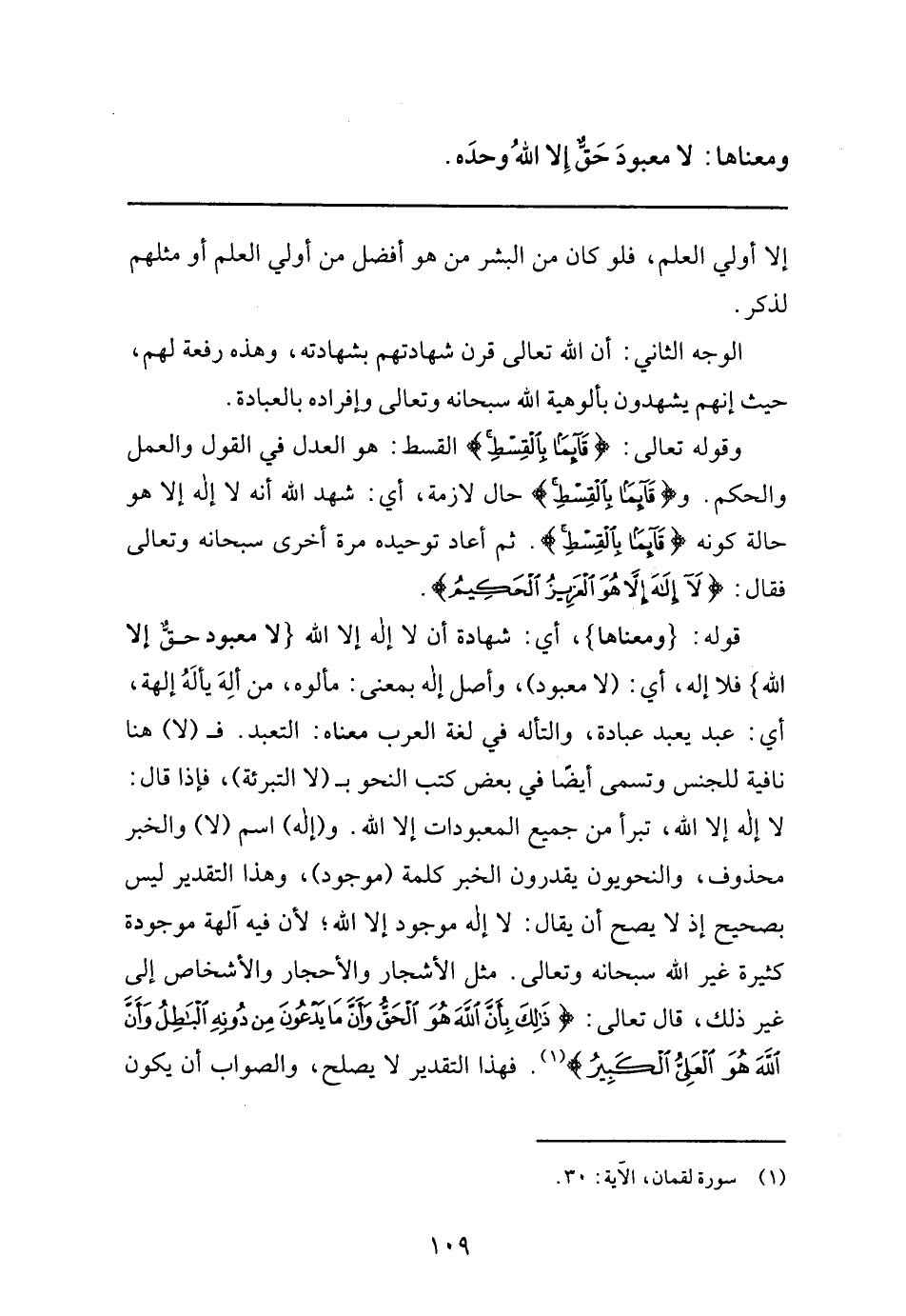 قوله: "ومعناها"، أي: شهادة أن لا إله إلا الله "لا معبود حق إلا الله" فلا إله، أي: "لا معبود"، وأصل إله بمعنى: مألوه، من أله يأله إلهة، أي: عبد يعبد عبادة، والتأله في لغة العرب معناه: التعبد. فـ"لا" هنا نافية للجنس وتسمى أيضاً في بعض كتب النحو بـ"لا التبرئة"، فإذا قال: لا إله إلا الله، تبرأ من جميع المعبودات إلا الله. و"إله" اسم "لا" والخبر محذوف، والنحويون يقدرون الخبر كلمة "موجود"، وهذا التقدير ليس بصحيح إذ لا يصح أن يقال: إله موجود إلا الله؛ لأن فيه آلهة موجودة كثيرة غير الله سبحانه وتعالى. مثل الأشجار والأحجار والأشخاص إلى غير ذلك، قال تعالى: {ذَلِكَ بِأَنَّ اللَّهَ هُوَ الْحَقُّ وَأَنَّ مَا يَدْعُونَ مِنْ دُونِهِ الْبَاطِلُ وَأَنَّ اللَّهَ هُوَ الْعَلِيُّ الْكَبِيرُ} 1. فهذا التقدير لا يصلح، والصواب أن يكون