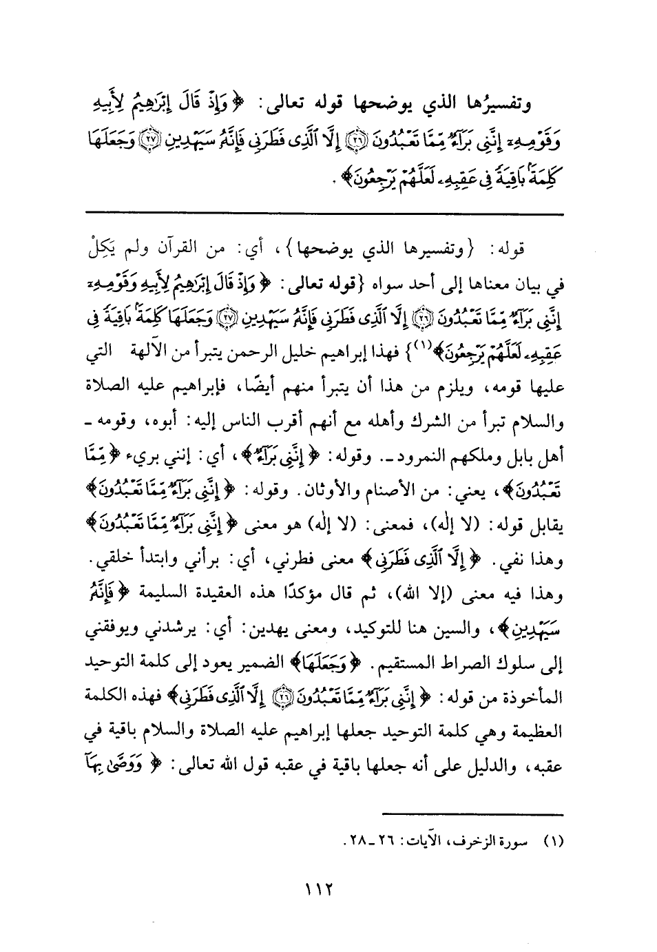 قوله: "وتفسيرها الذي يوضحها"، أي: من القرآن الكريم ولم يكل في بيان معناها إلى أحد سواه "قَوْلُهُ تَعَالَى: {وَإِذْ قَالَ إِبْرَاهِيمُ لِأَبِيهِ وَقَوْمِهِ إِنَّنِي بَرَاء مِّمَّا تَعْبُدُونَ إِلَّا الَّذِي فَطَرَنِي فَإِنَّهُ سَيَهْدِينِ وَجَعَلَهَا كَلِمَةً بَاقِيَةً فِي عَقِبِهِ لَعَلَّهُمْ يَرْجِعُونَ} 1" فهذا إبراهيم خليل الرحمن يتبرأ من الآلهة التي عليها قومه، ويلزم من هذا أن يتبرأ منهم أيضاً، فإبراهيم عليه الصلاة والسلام تبرأ من الشرك وأهله مع أنهم أقرب الناس إليه: أبوه، وقومه –أهل بابل وملكهم نمرود- وقوله: {إِنَّنِي بَرَاء} ، أي: إنني بريء {مِّمَّا تَعْبُدُونَ} ، يعني: من الأصنام والأوثان. وقوله: {إِنَّنِي بَرَاء مِّمَّا تَعْبُدُونَ} يقابل قوله: "لا إله"، فمعنى: "لا إله" هو معنى {إِنَّنِي بَرَاء مِّمَّا تَعْبُدُونَ} وهذا نفي. {إِلَّا الَّذِي فَطَرَنِي} معنى فطرني، أي: برأني وابتدأ خلقي. وهذا فيه معنى "إلا الله"، ثم قال مؤكداً هذه العقيدة السليمة {فَإِنَّهُ سَيَهْدِينِ} ، السين هنا للتوكيد، ومعنى يهدين: أي: يرشدني ويوفقني إلى سلوك الصراط المستقيم. {وَجَعَلَهَا} الضمير يعود إلى كلمة التوحيد المأخوذ من قوله: {إِنَّنِي بَرَاء مِّمَّا تَعْبُدُونَ إِلَّا الَّذِي فَطَرَنِي} فهذه الكلمة العظيمة وهي كلمة التوحيد جعلها إبراهيم عليه الصلاة والسلام باقية في عقبه، والدليل على أنه جعلها باقية في عقبه قول الله تعالى: {وَوَصَّى بِهَا