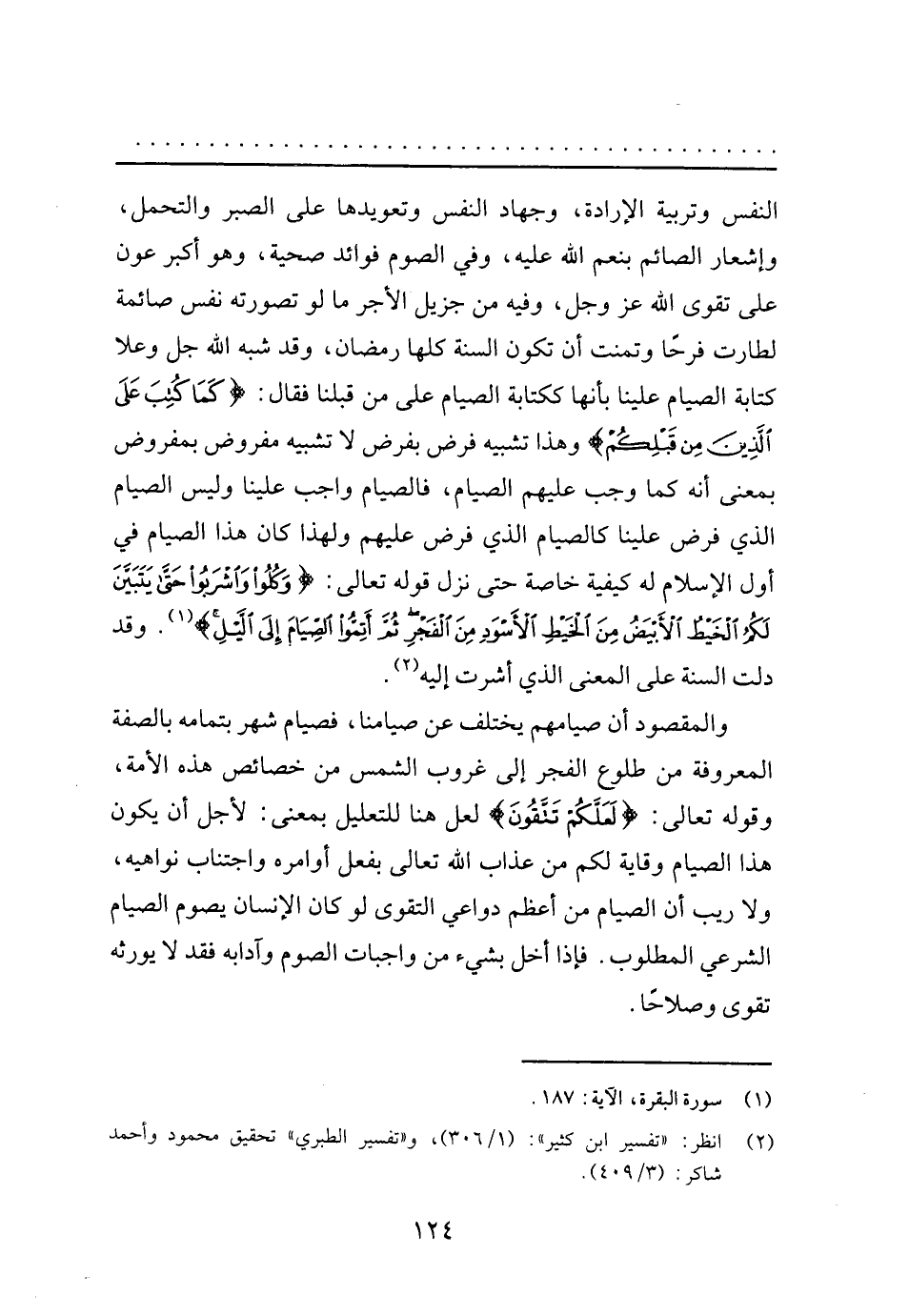 النفس وتربية الإرادة، وجهاد النفس وتعويدها على الصبر والتحمل، وإشعار الصائم بنعم الله عليه، وفي الصوم فوائد صحية، وهو أكبر عون على تقوى الله عز وجل، وفيه من جزيل الأجر ما لو تصورته نفس صائمة لطارت فرحاً وتمنت أن تكون السنة كلها رمضان، وقد شبه الله جل وعلا كتابة الصيام علينا بأنها كتابة الصيام على من قبلنا فقال: {كَمَا كُتِبَ عَلَى الَّذِينَ مِنْ قَبْلِكُمْ} وهذا تشبيه فرض لا تشبيه مفروض بمفروض بمعنى أنه كما وجب عليهم الصيام، فالصيام واجب علينا وليس الذي فرض علينا كالصيام الذي فرض عليهم ولهذا كان هذا الصيام في أول الإسلام له كيفية خاصة حتى نزل قوله تعالى: {وَكُلُوا وَاشْرَبُوا حَتَّى يَتَبَيَّنَ لَكُمُ الْخَيْطُ الْأَبْيَضُ مِنَ الْخَيْطِ الْأَسْوَدِ مِنَ الْفَجْرِ ثُمَّ أَتِمُّوا الصِّيَامَ إِلَى اللَّيْلِ} 1. وقد دلت السنة على المعنى الذي أشرت إليه2.