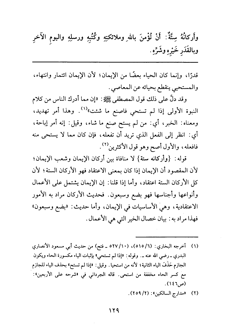 قوله: "وأركانه ستة" لا منافاة بين أركان الإيمان وشعب الإيمان؛ لأن المقصود أن الإيمان إذا كان بمعنى الاعتقاد فهو الأركان الستة؛ لأن كل الأركان الستة اعتقاد، وأما إذا قلنا: إن الإيمان يشتمل على الأعمال وأنواعها وأجناسها فهو بضع وسبعون. فحديث الأركان مراد به الأمور الاعتقادية، وهي الأساسيات في الإيمان، وأما حديث: "بضع وسبعون" فهذا مراد به: بيان خصال الخير التي هي الأعمال.