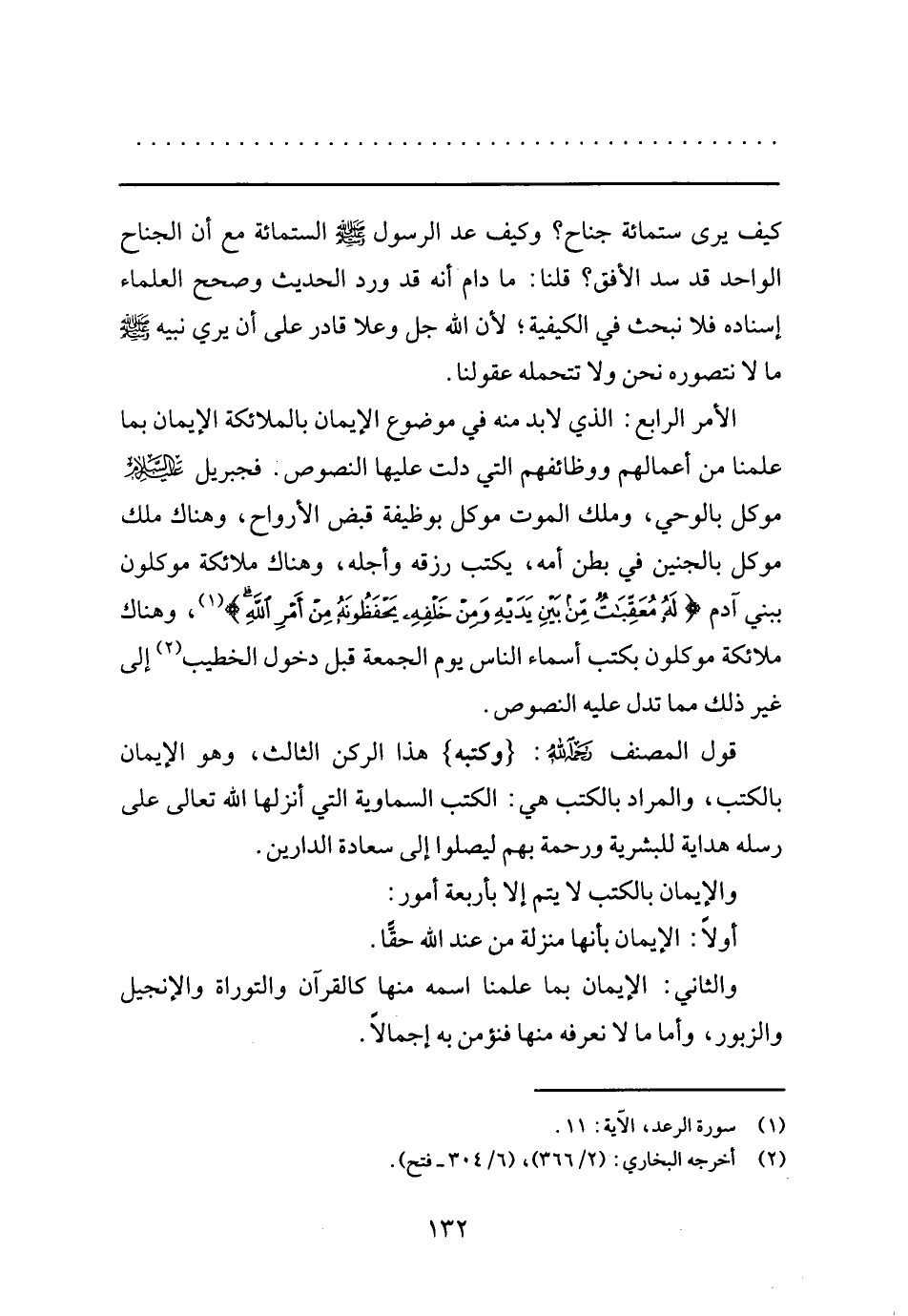 الأمر الرابع: الذي لابد منه في موضوع الإيمان الملائكة الإيمان بما علمنا من أعمالهم ووظائفهم التي دلت عليها النصوص. فجبريل عليه السلام موكل بالوحي، وملك الموت موكل بوظيفة قبض الأرواح، وهناك ملك موكل بالجنين في بطن أمه، يكتب رزقه وأجله، وهناك ملائكة موكلون ببني آدم {لَهُ مُعَقِّبَاتٌ مِنْ بَيْنِ يَدَيْهِ وَمِنْ خَلْفِهِ يَحْفَظُونَهُ مِنْ أَمْرِ اللَّهِ} 1، وهناك ملائكة موكلون بكتب أسماء الناس يوم الجمعة قبل دخول الخطيب2 إلى غير ذلك مما تدل عليه النصوص.