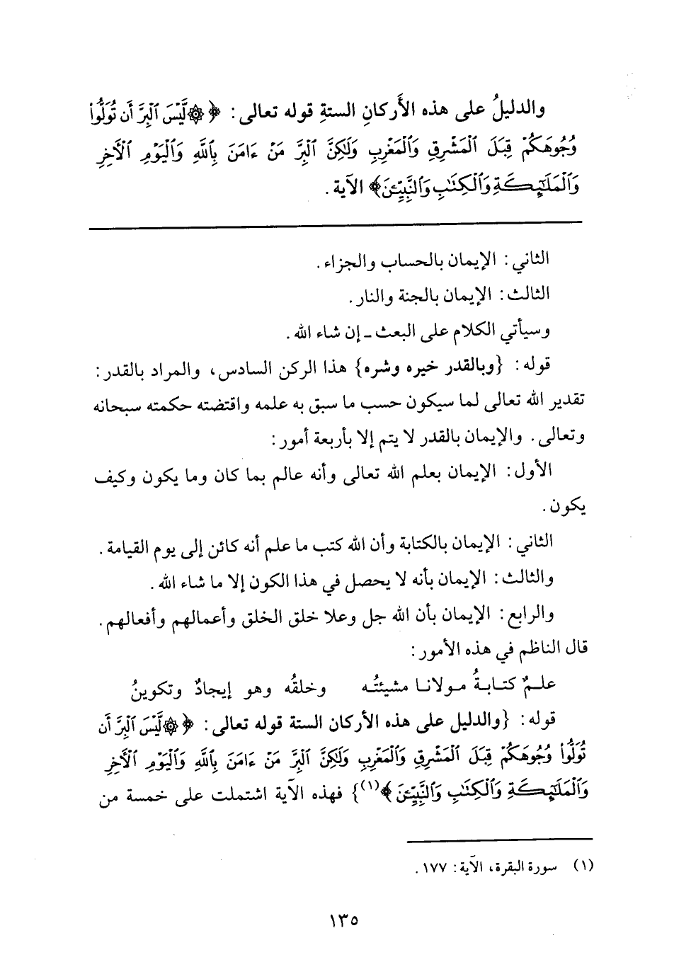 قوله: "وَالدَّلِيلُ عَلَى هَذِهِ الأَرْكَانِ السِّتَةِ قَوْلُهُ تَعَالَى: {لَيْسَ الْبِرَّ أَنْ تُوَلُّوا وُجُوهَكُمْ قِبَلَ الْمَشْرِقِ وَالْمَغْرِبِ وَلَكِنَّ الْبِرَّ مَنْ آمَنَ بِاللَّهِ وَالْيَوْمِ الْآخِرِ وَالْمَلائِكَةِ وَالْكِتَابِ وَالنَّبِيِّينَ} 1" فهذه الآية اشتملت على خمسة من