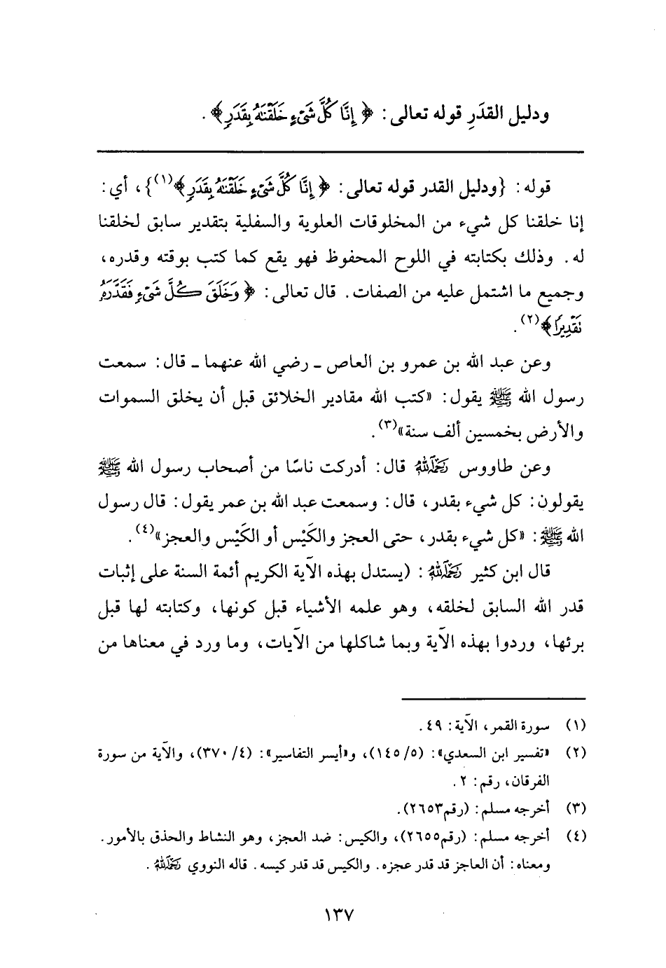 قوله: "ودليل القدر قَوْلُهُ تَعَالَى: {إِنَّا كُلَّ شَيْءٍ خَلَقْنَاهُ بِقَدَرٍ} 1"، أي: إنا خلقنا كل شيء من المخلوقات العلوية والسفلية بتقدير سابق لخلقنا له. وذلك بكتابته في اللوح المحفوظ فهو يقع كما كتب بوقته وقدره، وجميع ما اشتمل عليه من الصفات. قال تعالى: {وَخَلَقَ كُلَّ شَيْءٍ فَقَدَّرَهُ تَقْدِيراً} 2.