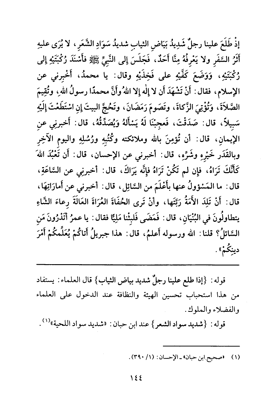 إذا طَلَعَ عَلَيْنَا رَجُلٌ شَدِيدُ بَيَاضِ الثِّيَابِ شَدِيدُ سَوَادِ الشَّعْرِ، لا يُرَى عَلَيْهِ أَثَرُ السَّفَرِ وَلا يَعْرِفُهُ مِنَّا أَحَدٌ، فَجَلَسَ إِلَى النَّبِيِّ صَلَّى اللهُ عَلَيْهِ وَسَلَّمَ فَأَسْنَدَ رُكْبَتَيْهِ إِلَى رُكْبَتَيْهِ، وَوَضَعَ كَفَّيْهِ عَلَى فَخِذَيْهِ وَقَالَ: يَا مُحَمَّدُ، أَخْبِرْنِي عَنِ الإِسْلامِ، فَقَالَ: "أَنْ تَشْهَدَ أن لا اله إلا الله وأن محمدا رَسُولُ اللهِ، وَتُقِيمَ الصَّلاةَ، وَتُؤْتِيَ الزَّكَاةَ، وَتَصُومَ رَمَضَانَ، وَتَحُجَّ الْبَيْتَ إِنْ اسْتَطَعْتَ إِلَيْهِ سَبِيلا"، قَالَ: صَدَقْتَ، فَعَجِبْنَا لَهُ يَسْأَلُهُ وَيُصَدِّقُهُ، قَالَ: أَخْبِرْنِي عَنِ الإِيمَانِ، قَالَ: "أَنْ تُؤْمِنَ بِاللهِ وملائكته وكتبه ورسله واليوم الآخر وبالقدر خيره وشره"، قَالَ: أَخْبِرْنِي عَنِ الإِحْسَانِ، قَالَ: "أَنْ تَعْبُدَ الله كأنك تراه، فإن لم تكن تراه فَإِنَّهُ يَرَاكَ، قَالَ: أَخْبِرْنِي عَنِ السَّاعَةِ، قَالَ: "مَا الْمَسْؤُولُ عَنْهَا بِأَعْلَمَ مِنَ السَّائِلِ"، قَالَ: أخبرني عَنْ أَمَارَاتِهَا، قَالَ:"أَنْ تَلِدَ الأَمَةُ رَبَّتَهَا، وَأَنْ تَرَى الْحُفَاةَ الْعُرَاةَ الْعَالَةَ رِعَاءَ الشَّاءِ يَتَطَاوَلُونَ فِي الْبُنْيَانِ"، قَالَ: فَمَضَى فَلَبِثْنَا مَلِيَّا فَقَالَ: "يَا عُمَرُ أَتَدْرُونَ مَنِ السَّائِلِ"؟ قُلْنَا: اللهُ وَرَسُولُهُ أَعْلَمُ، قَالَ: "هَذَا جِبْرِيلُ أَتَاكُمْ يعلمكم أمر دينكم".