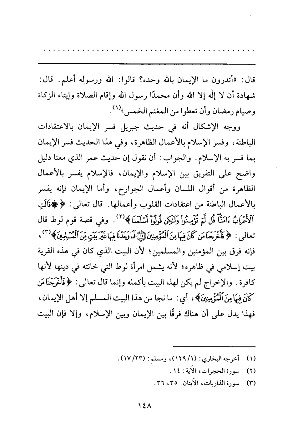 ووجه الإشكال أنه في حديث جبريل فسر الإيمان بالاعتقادات الباطنة وفسر الإسلام بالأعمال الظاهرة، وفي هذا الحديث فسر الإيمان بما فسر به الإسلام. والجواب: أن نقول إن حديث عمر الذي معنا دليل واضح على التفريق بين الإسلام والإيمان، فالإسلام يفسر بالأعمال الظاهرة من أقوال اللسان وأعمال الجوارح، وأما الإيمان فإنه يفسر بالأعمال الباطنة من اعتقادات القلوب وأعمالها. قال تعالى: {قَالَتِ الْأَعْرَابُ آمَنَّا قُلْ لَمْ تُؤْمِنُوا وَلَكِنْ قُولُوا أَسْلَمْنَا} 2. وفي قصة قوم لوط قال تعالى: {فَأَخْرَجْنَا مَنْ كَانَ فِيهَا مِنَ الْمُؤْمِنِينَ فَمَا وَجَدْنَا فِيهَا غَيْرَ بَيْتٍ مِنَ الْمُسْلِمِينَ} 3، فإنه فرق بن المؤمنين والمسلمين؛ لأن البيت الذي كان هذه القرية بيت إسلامي في ظاهره؛ لأنه يشمل امرأة لوط التي خانته في دينها لأنها كافرة. والإخراج لم يكن لهذا البيت بأكمله وإنما قال تعالى: {فَأَخْرَجْنَا مَنْ كَانَ فِيهَا مِنَ الْمُؤْمِنِينَ} ، أي: ما نجا من هذا البيت المسلم إلا أهل الإيمان، فهذا يدل على أن هناك فرقاً بين الإيمان وبين الإسلام، وإلا فإن البيت