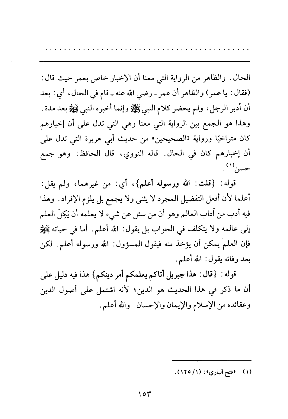 قوله: "قَالَ: هَذَا جِبْرِيلُ أَتَاكُمْ يُعَلِّمُكُمْ أَمْرَ دِينِكُم" هذا دليل على أن ما ذكر في هذا الحديث هو الدين؛ لأنه اشتمل على أصول الدين وعقائده من الإسلام والإسلام والإحسان. والله أعلم.