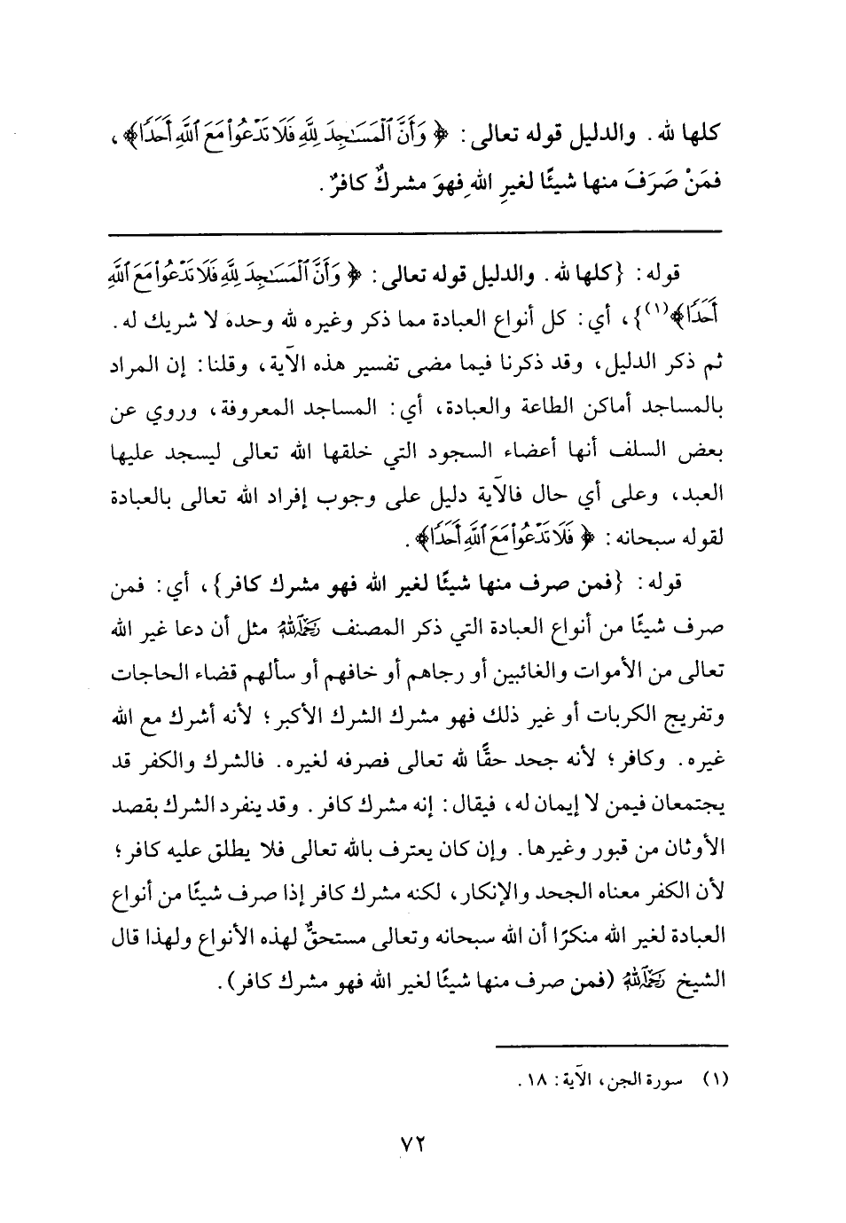 وقوله: "كلها لله، وَالدَّلِيلُ قَوْلُهُ تَعَالَى: {وَأَنَّ الْمَسَاجِدَ لِلَّهِ فَلا تَدْعُو مَعَ اللَّهِ أَحَداً} 1"، أي: كل أنواع العبادة مما ذكر وغيره لله وحده لا شريك له. ثم ذكر الدليل، وقد ذكرنا فيما مضى تفسير هذه الآية، وقلنا: إن المراد بالمساجد أماكن الطاعة والعبادة، أي: المساجد المعروفة، وروي عن بعض السلف أنها أعضاء السجود التي خلقها الله تعالى ليسجد عليها العبد، وعلى أي حال فالآية دليل على وجوب إفراد الله تعالى بالعبادة لقوله سبحانه: {فَلا تَدْعُو مَعَ اللَّهِ أَحَداً} .