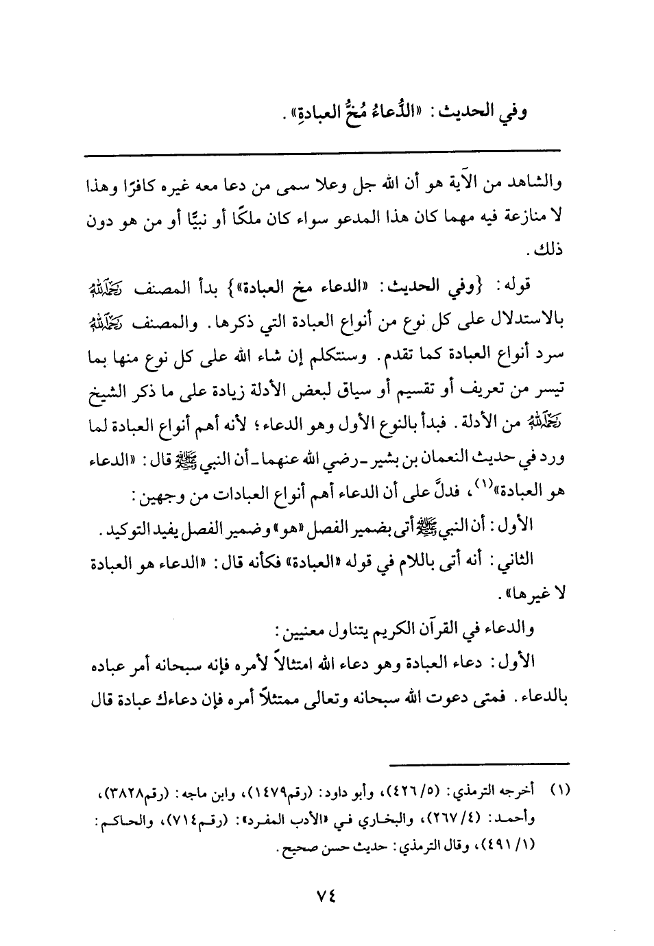 قوله: "في الحديث: "الدعاء مخ العبادة" بدأ المصنف رحمه الله بالاستدلال على كل نوع من أنواع العبادة التي ذكرها. والمصنف رحمه الله سرد أنواع العبادة كما تقدم. وسنتكلم إن شاء الله على كل نوع منها بما بيسر من تعريف أو تقسيم أو سياق لبعض الأدلة زيادة على ما ذكر الشيخ رحمه الله من الأدلة. فبدأ بالنوع الأول وهو الدعاء؛ لأنه أهم أنواع العبادة لما ورد في حديث النعمان بن بشير رضي الله عنهما أن النبي صلى الله عليه وسلم قال: "الدعاء هو العبادة" 1، فدل على أن الدعاء أهم أنواع العبادات من وجهين: