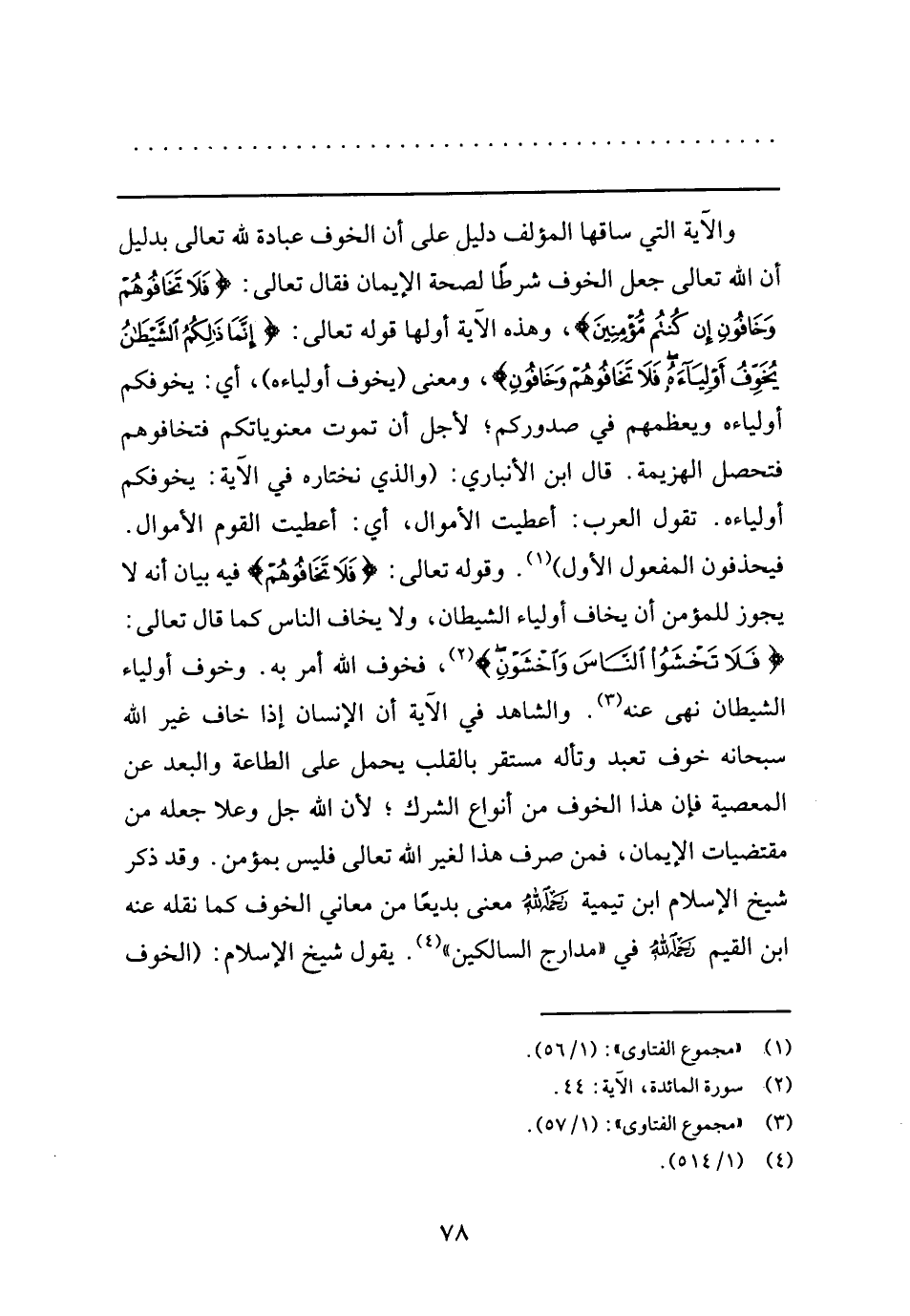 والآية التي ساقها المؤلف دليل على أن الخوف عبادة لله تعالى بدليل أن الله جعل الخوف شرطاً لصحة الإيمان فقال تَعَالَى: {فَلا تَخَافُوهُمْ وَخَافُونِ إِنْ كُنْتُمْ مُؤْمِنِينَ} ، وهذه الآية أولها قوله تعالى: {إِنَّمَا ذَلِكُمُ الشَّيْطَانُ يُخَوِّفُ أَوْلِيَاءَهُ فَلا تَخَافُوهُمْ وَخَافُونِ} ، ومعنى "يخوف أولياءه"، أي: يخوفكم أولياءه ويعظمهم في صدوركم؛ لأجل أن تموت معنوياتكم فتخافوهم فتحصل الهزيمة. قال الأنباري: "والذي نختاره في الآية: يخوفكم أولياءه. تقول العرب: أعطيت الأموال، أي: أعطيت القوم الأموال. فيحذفون المفعول الأول"1. وقوله تعالى: {فَلا تَخَافُوهُمْ} فيه بيان أنه لا يجوز للمؤمن أن يخاف أولياء الشيطان، ولا يخاف الناس كما قال تعالى: {فَلا تَخْشَوُا النَّاسَ وَاخْشَوْنِ} 2، فخوف الله أمر به. وخوف أولياء الشيطان نهى عنه3. والشاهد في الآية أن الإنسان إذا خاف غير الله سبحانه خوف تعبد وتأله مستقر بالقلب يحمل على الطاعة والبعد عن المعصية فإن هذا الخوف من أنواع الشرك؛ لأن الله جل وعلا جعله من مقتضيات الإيمان، فمن صرف هذا لغير الله تعالى فليس بمؤمن. وقد ذكر شيخ الإسلام ابن تيمية رحمه الله معنى بديعاً من معاني الخوف كما نقله عنه ابن القيم رحمه الله في "مدارج السالكين"4. يقول شيخ الإسلام: "الخوف