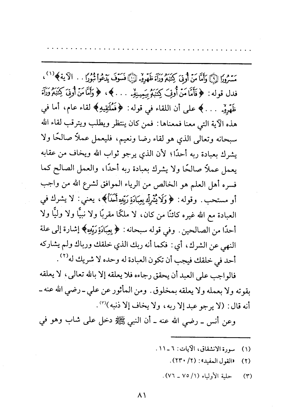 مَسْرُوراً وَأَمَّا مَنْ أُوتِيَ كِتَابَهُ وَرَاء ظَهْرِهِ فَسَوْفَ يَدْعُو ثُبُوراً.. الآية} 1، فدل قوله: {فَأَمَّا مَنْ أُوتِيَ كِتَابَهُ بِيَمِينِهِ ... } ، {وَأَمَّا مَنْ أُوتِيَ كِتَابَهُ وَرَاء ظَهْرِهِ ... } على أن اللقاء في قوله: {فَمُلَاقِيهِ} لقاء عام، أما في هذه الآية التي معنا فمعناها: فمن كان ينتظر ويطلب ويترقب لقاء الله سبحانه وتعالى الذي هو لقاء رضا ونعيم، فليعمل عملاً صالحاً ولا يشرك بربه أحدا؛ لأن الذي يرجو ثواب الله ويخاف من عقابه يعمل عَمَلاً صَالِحاً وَلاَ يُشْرِكْ بِعِبَادَةِ رَبِّهِ أَحَداً، والعمل الصالح كما فسره أهل هو الخالص من الياء الموافق لشرع الله من واجب أو مستحب. وقوله: {وَلا يُشْرِكْ بِعِبَادَةِ رَبِّهِ أَحَداً} ، يعني: لا يشرك في العبادة مع الله غيره كائناً من كان، لا ملكاً مقرباً ولا نبياً ولا ولياً ولا أحداً من الصالحين. وفي قوله سبحانه: {بِعِبَادَةِ رَبِّهِ أَحَداً} إشارة إلى علة النهي عن الشرك، أي: فكما أنه ربك الذي خلقك ورباك ولم يشاركه أحد في خلقك فيجب أن تكون العبادة له وحده لا شريك له2.