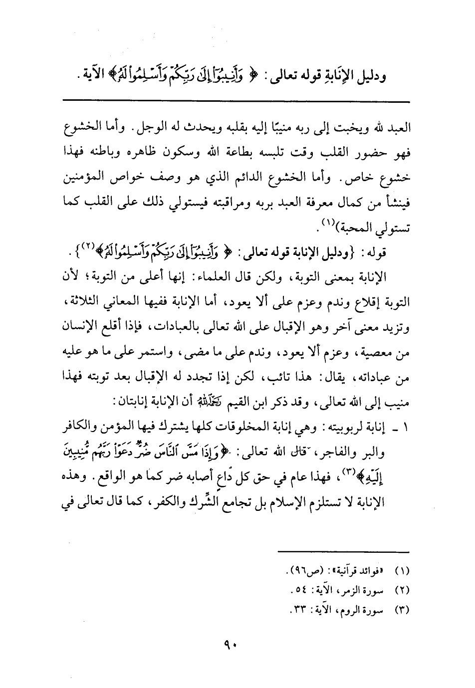 قوله: "وَدَلِيلُ الإِنَابَةِ قَوْلُهُ تَعَالَى: {وَأَنِيبُوا إِلَى رَبِّكُمْ وَأَسْلِمُوا لَهُ} 2". الإنابة بمعنى التوبة، ولكن قال العلماء: إنها أعلى من التوبة؛ لأن التوبة إقلاع وندم وعزم على ألا يعود، أما الإنابة ففيها المعاني الثلاثة، وتزيد معنى آخر وهو الإقبال على الله تعالى بالعبادات، فإذا أقلع الإنسان من معصية، وعزم ألا يعود، وندم على ما مضى، واستمر على ما هو عليه من عباداته، يقال: هذا تائب، لكن من معصية، وعزم ألا يعود، وندم على ما مضى، واستمر على ما هو عليه من عباداته، يقال: هذا تائب، لكن إذا تجدد له الإقبال بعد موته فهذا منيب إلى الله تعالى، وقد ذكر ابن القيم رحمه الله أن الإنابة إنابتان:
