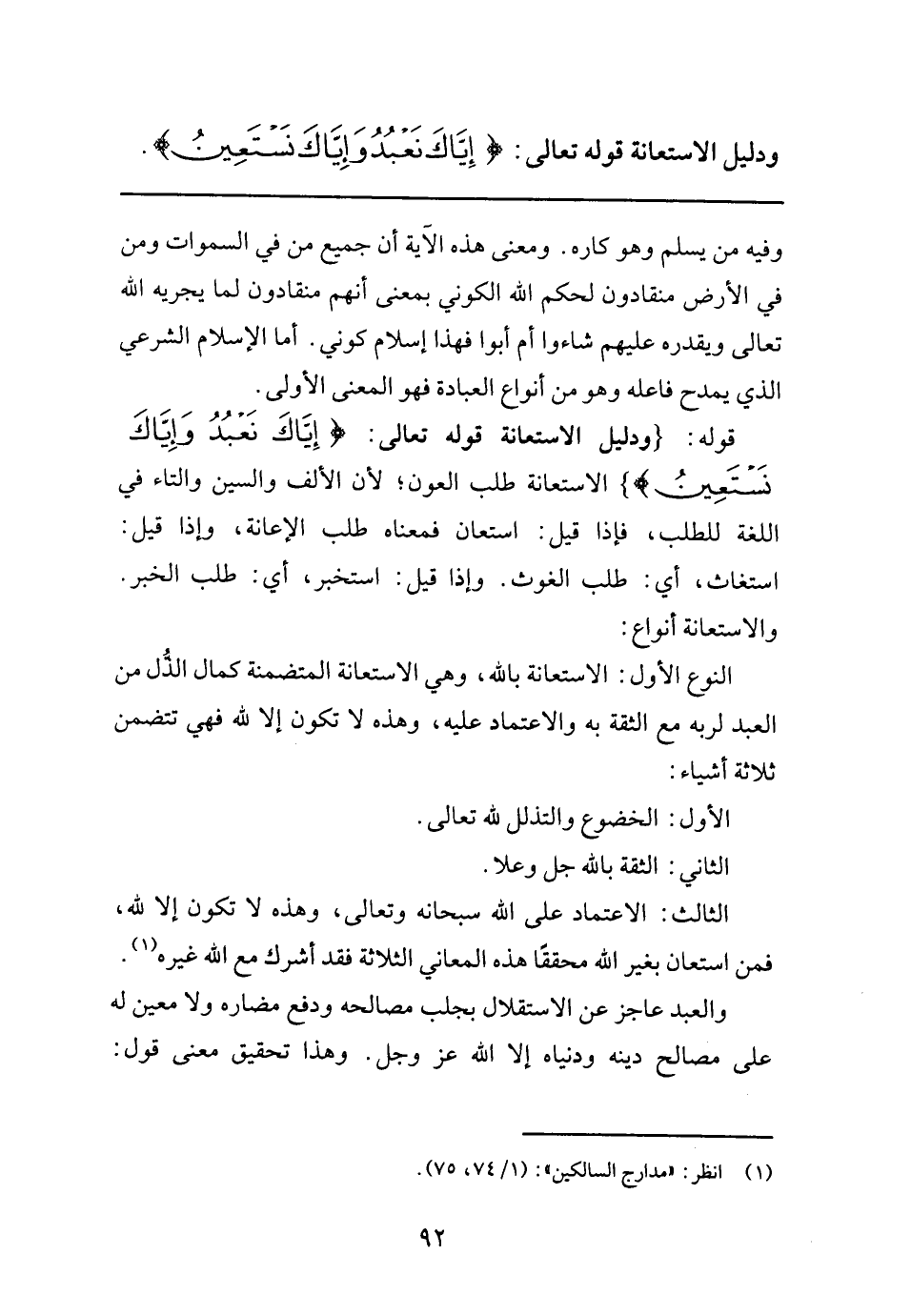 النوع الأول: الاستعانة بالله، وهي الاستعانة المتضمنة كمال الذل من العبد لربه مع الثقة به والاعتماد عليه، وهذه لا تكون إلا لله فهي تتضمن ثلاثة أشياء: