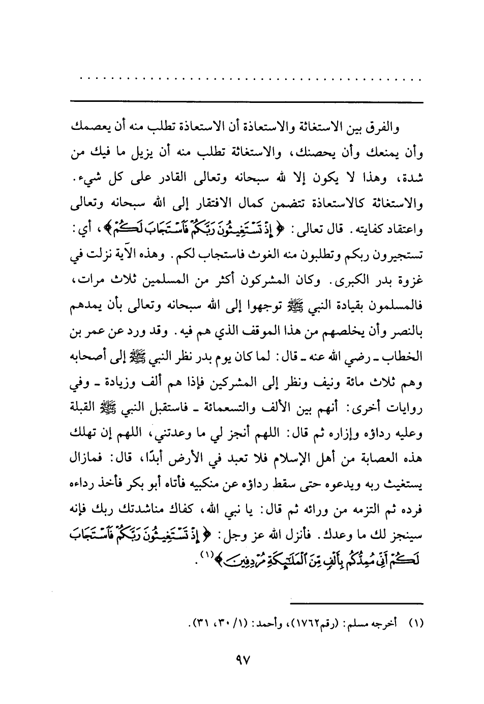 والفرق بين الاستغاثة والاستعاذة تطلب منه أن يعصمك وأن يمنعك وأن يحصنك، والاستغاثة تطلب منه أن يزيل ما فيك من شدة، وهذا لا يكون إلا لله سبحانه وتعالى القادر على كل شيء. والاستغاثة كالاستعاذة تتضمن كمال الافتقار إلى الله سبحانه وتعالى واعتقاد كفايته. قال تعالى: {إِذْ تَسْتَغِيثُونَ رَبَّكُمْ فَاسْتَجَابَ لَكُمْ} ، أي: تستجيرون ربكم وتطلبون منه الغوث فاستجاب لكم. وهذه الآية نزلت في عزوة بدر الكبرى. وكان المشركون أكثر من المسلمين ثلاث مرات، فالمسلمون بقيادة النبي صلى الله عليه وسلم توجهوا إلى الله سبحانه وتعالى بأن يمدهم بالنصر وأن يخلصهم من هذا الموقف الذي هم فيه. وقد ورد عَنْ عُمَرَ بنِ الْخَطَّابِ رَضِيَ اللهُ عَنْهُ قال: لما كان يوم بدر نظر النبي صلى الله عليه وسلم إلى أصحابه وهم ثلاث مائة ونيف ونظر إلى المشركين فإذا هم ألف وزيادة –وفي روايات أخرى: أنهم بين الألف والتسعمائة- فاستقل النبي صلى الله عليه وسلم القبلة وعليه رداؤه وإزاره ثم قال: "اللهم أنجز لي ما عدتني، اللهم إن تهلك هذه العصابة من أهل الإسلام فلا تعبد في الأرض أبداً، قال: فما زال يستغيث ربه ويدعوه حتى سقط رداؤه عن منكبيه فأتاه أبو بكر فأخذ رداءه فرده ثم التزامه من ورائه ثم قال: يا نبي الله، كفاك مناشدتك ربك فإنه سينجز لك ما وعدك. فأنزل الله عز وجل: {إِذْ تَسْتَغِيثُونَ رَبَّكُمْ فَاسْتَجَابَ لَكُمْ أَنِّي مُمِدُّكُمْ بِأَلْفٍ مِنَ الْمَلائِكَةِ مُرْدِفِينَ} 1.