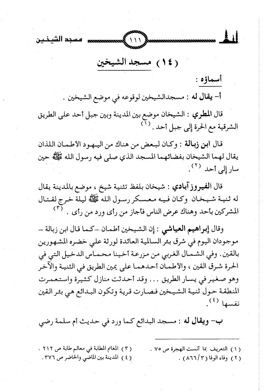 قال ابن زبالة: وكان لبعض من هناك من اليهود الأطمان اللذان يقال لهما الشيخان بفضائهما المسجد الذي صلى فيه رسول الله صلى الله عليه وسلم حين سار إِلى أحد. (2)