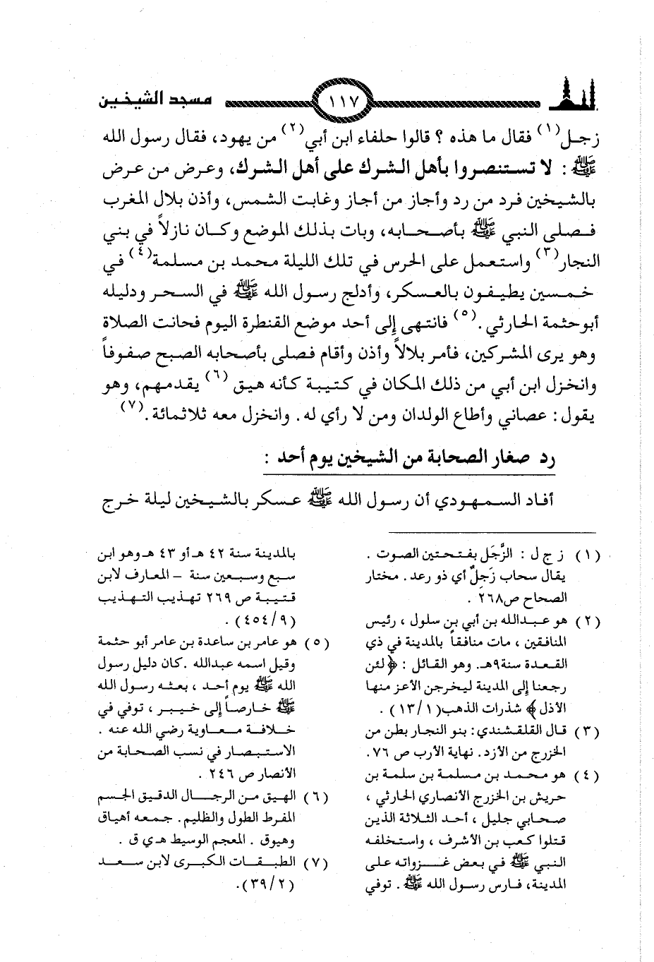 زجل (1) فقال ما هذه؟ قالوا حلفاء ابن أبي (2) من يهود، فقال رسول الله صلى الله عليه وسلم: لا تستنصروا بأهل الشرك على أهل الشرك، وعرض من عرض بالشيخين فرد من رد وأجاز من أجاز وغابت الشمس، وأذن بلال المغرب فصلى النبي صلى الله عليه وسلم بأصحابه، وبات بذلك الموضع وكان نازلاً في بني النجار (3) واستعمل على الحرس في تلك الليلة محمد بن مسلمة (4) في خمسين يطيفون بالعسكر، وأدلج رسول الله صلى الله عليه وسلم في السحر ودليله أبو حثمة الحارثي (5). فانتهى إِلى أحد موضع القنطرة اليوم فحانت الصلاة وهو يرى المشركين، فأمر بلالاً وأذن وأقام فصلى بأصحابه الصبح صفوفاً وانخزل ابن أبي من ذلك المكان في كتيبة كأنه هيق (6) يقدمهم، وهو يقول: عصاني وأطاع الولدان ومن لا أرى له. وانخزل معه ثلاثمائة (7).