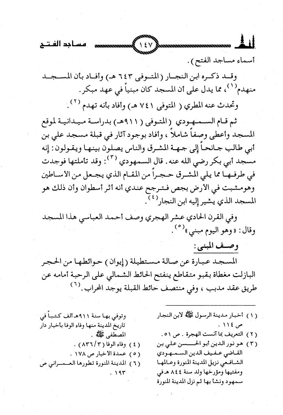 (3) هو نور الدين أبو الحسن علي بن القاضي عفيف الدين السمهودي الشافعي نزيل المدينة المنورة وعالمها ومفتيها ومؤرخها ولد سنة 844هـ في سمهود ونشأ بها ثم نزل المدينة المنورة وتوفي بها سنة 911هـ ألف كتباً في تاريخ المدينة منها وفاء الوفا بأخبار دار المصطفى صلى الله عليه وسلم.