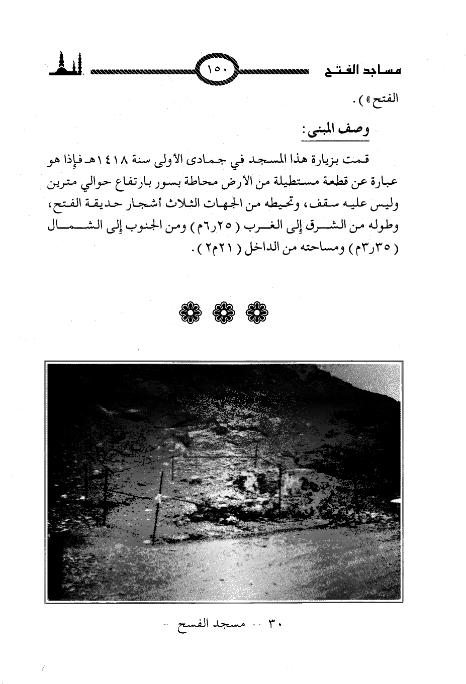 قمت بزيارة هذا المسجد في جمادي الأول سنة 1418 هـ فإذا هو عبارة عن قطعة مستطيلة من الأرض محاطة بسور بارتفاع حوالي مترين وليس عليه سقف، وتحيطه من الجهات الثلاث أشجار حديقة الفتح، وطوله من الشرق إلى الغرب (25ر 6م) ومن الجنوب إلى الشمال (35ر 3م) ومساحته من الداخل (21م2).