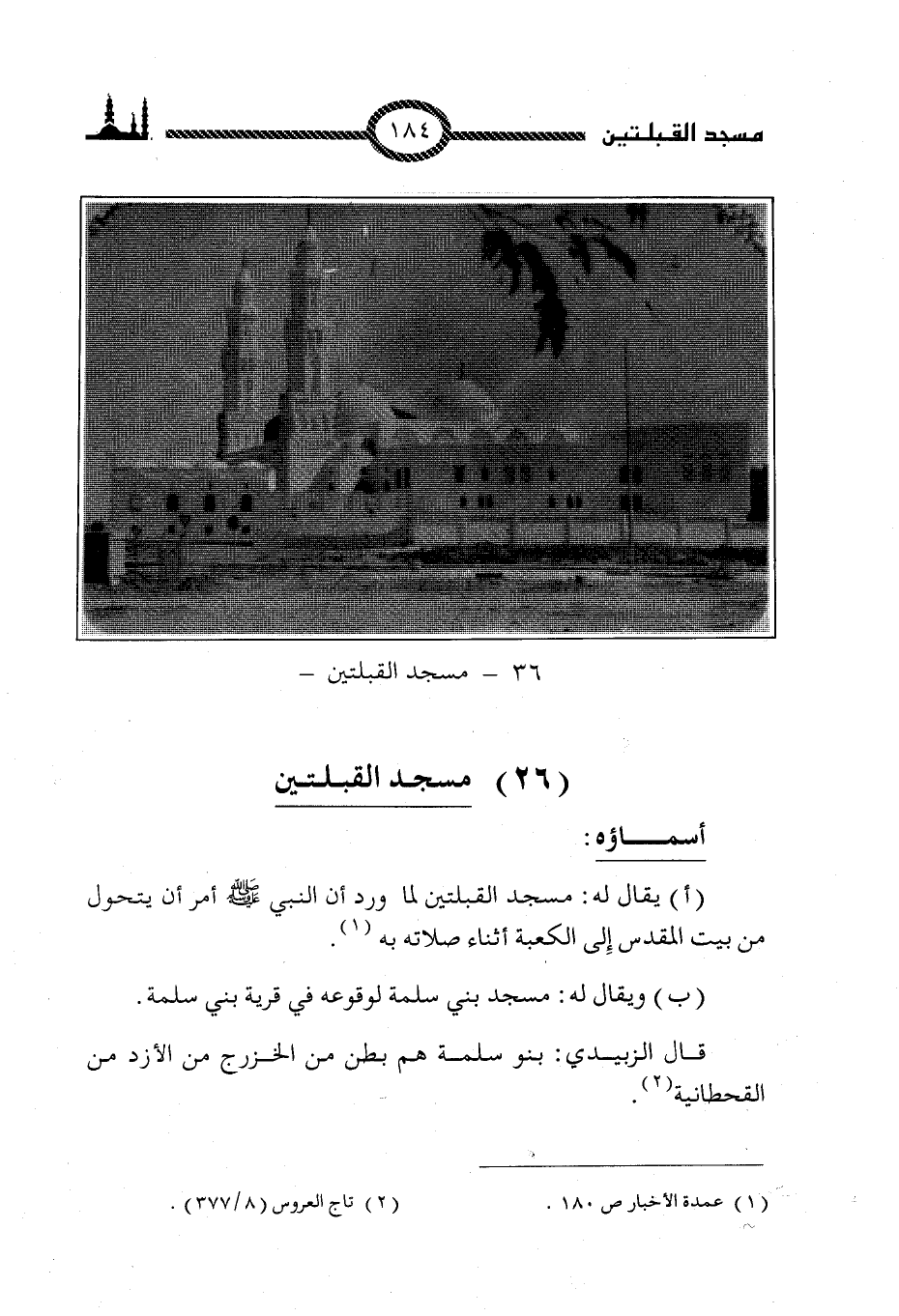 (أ) يقال له: مسجد القبلتين لما ورد أن النبي صلى الله عليه وسلم أمر أن يتحول من بيت المقدس إِلى الكعبة أثناء صلاته به (1).