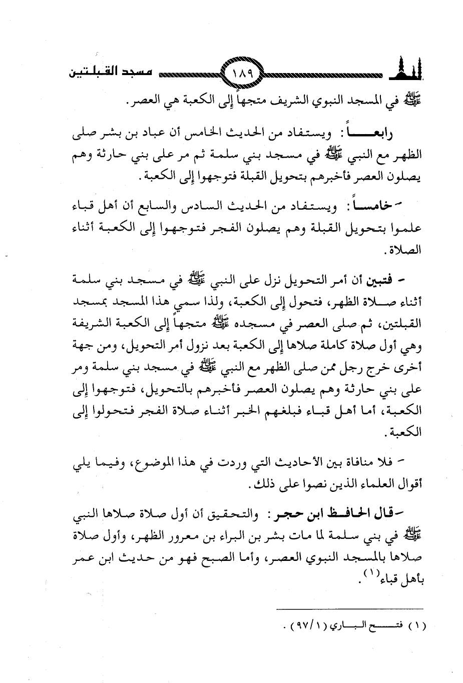 قال الحافظ ابن حجر: والتحقيق أن أول صلاة صلاها النبي صلى الله عليه وسلم في بني سلمة لما مات بشر بن البراء بن معرور الظهر، وأول صلاة صلاها بالمسجد النبوي العصر، وأما الصبح فهو من حديث ابن عمر بأهل قباء (1).
