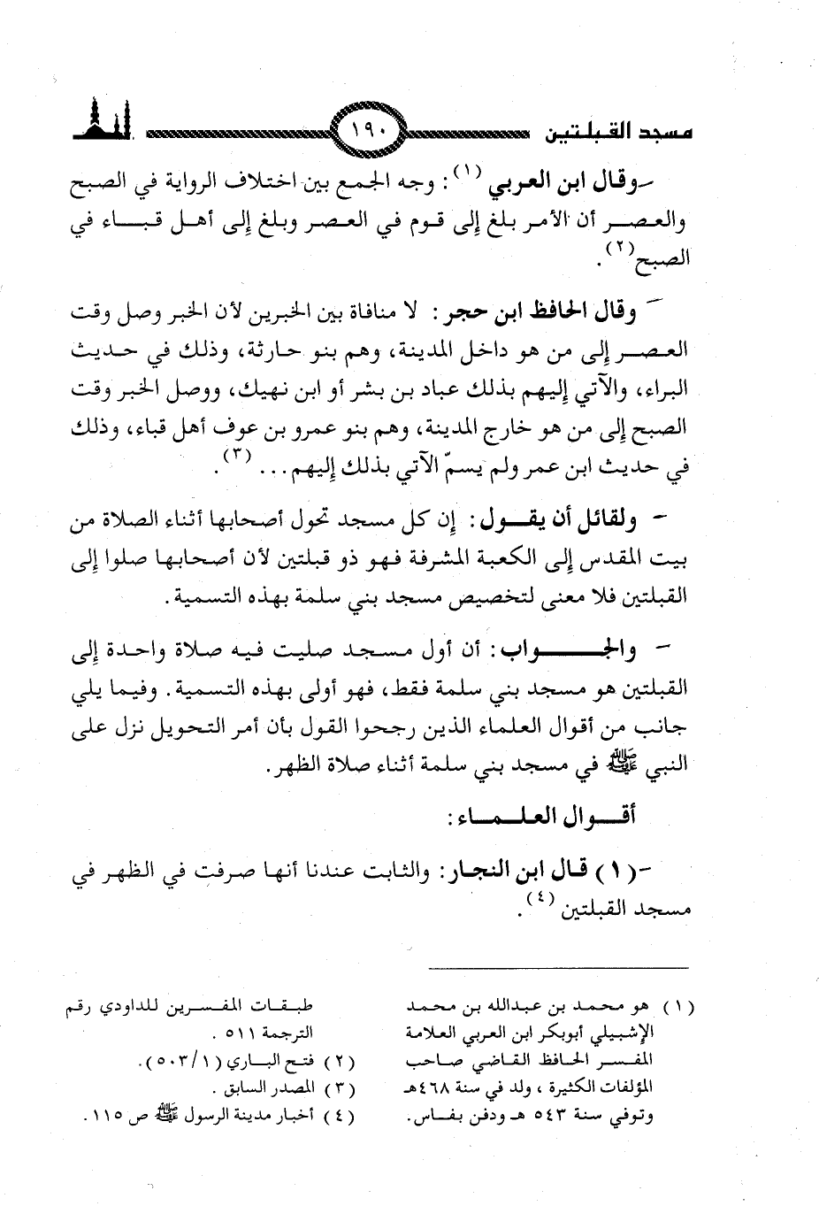 وقال الحافظ ابن حجر: لا منافاة بين الخبرين لأن الخبر وصل وقت العصر إِلى من هو داخل المدينة، وهم بنو حارثة، وذلك في حديث البراء، والآتي إِليهم بذلك عباد بن بشر أو ابن نهيك، ووصل الخبر وقت الصبح إِلى من هو خارج المدينة، وهم بنو عمرو بن عوف أهل قباء، وذلك في حديث ابن عمر ولم يسمّ الآتي بذلك إِليهم ... (3).