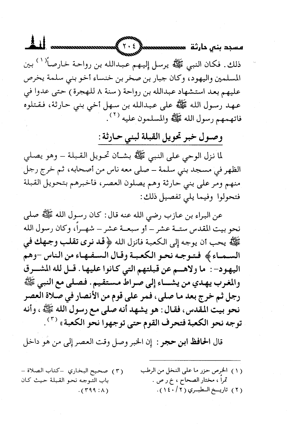 عن البراء بن عازب رضي الله عنه قال: كان رسول الله صلى الله عليه وسلم صلى نحو بيت المقدس ستة عشر- أو سبعة عشر - شهراً، وكان رسول الله صلى الله عليه وسلم يحب أن يوجه إلى الكعبة فأنزل الله {قد نرى تقلب وجهك في السماء} فتوجه نحو الكعبة وقال السفهاء من الناس - وهم اليهود -: وما ولاهم عن قبلتهم التي كانوا عليها. قال لله المشرق والمغرب يهدي من يشاء إلى صراط المستقيم. فصلى مع النبي صلى الله عليه وسلم رجل ثم خرج بعد ما صلى، فمر على قوم من الأنصار في صلاة العصر نحو بيت المقدس، فقال: هو يشهد أنه صلى مع رسول الله صلى الله عليه وسلم، وأنه توجه نحو الكعبة فتحرف القوم حتى توجهوا نحو الكعبة)) (3).
