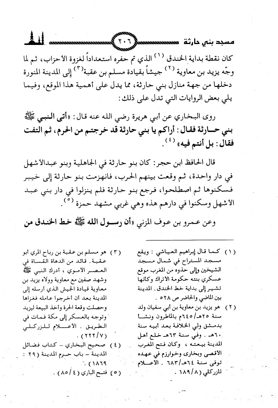 قال الحافظ ابن حجر: كان بنو حارثة في الجاهلية وبنو عبد الأشهل في دار واحدة، ثم وقعت بينهم الحرب، فانهزمت بنو حارثة إلى خبير فسكنوها ثم اصطلحوا، فرجع بنو حارثة فلم ينزلوا في دار بني عبد الأشهل وسكنوا في دارهم هذه وهي غربي مشهد حمزة (5).