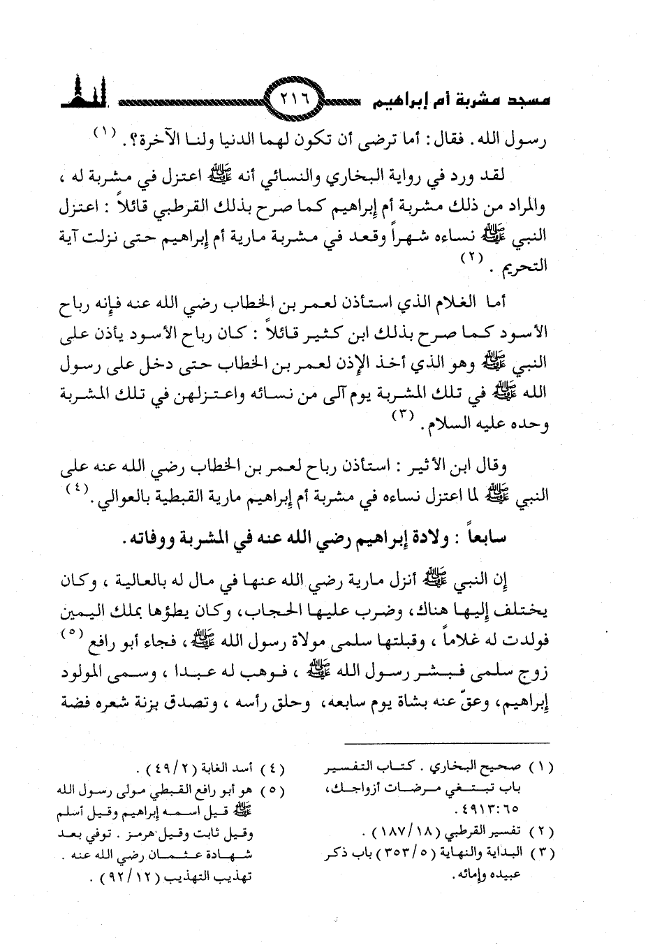 إن النبي صلى الله عليه وسلم أنزل مارية رضي الله عنها في مال له بالعالية، وكان يختلف إليها هناك، وضرب عليها الحجاب، وكان يطؤها بملك اليمن فولدت له غلاماً، وقبلتها سلمى مولاة رسول الله صلى الله عليه وسلم فجاء أبو رافع (5) زوج سلمى فبشر رسول الله صلى الله عليه وسلم، فوهب له عبداً، وسمى المولود إبراهيم، وعقّ عن بشاة يوم سابعة، وحلق رأسه، وتصدق بزنة شعره فضة.